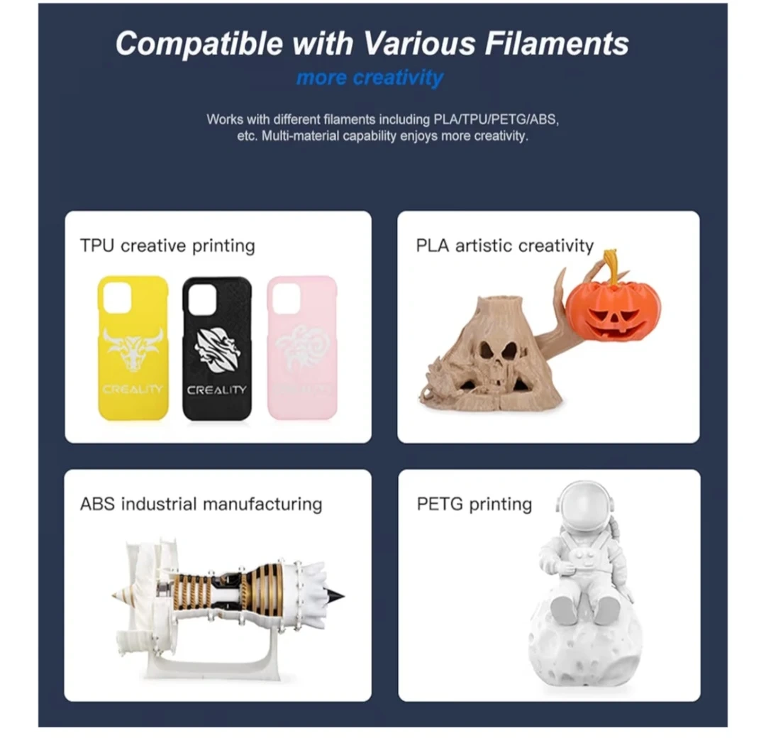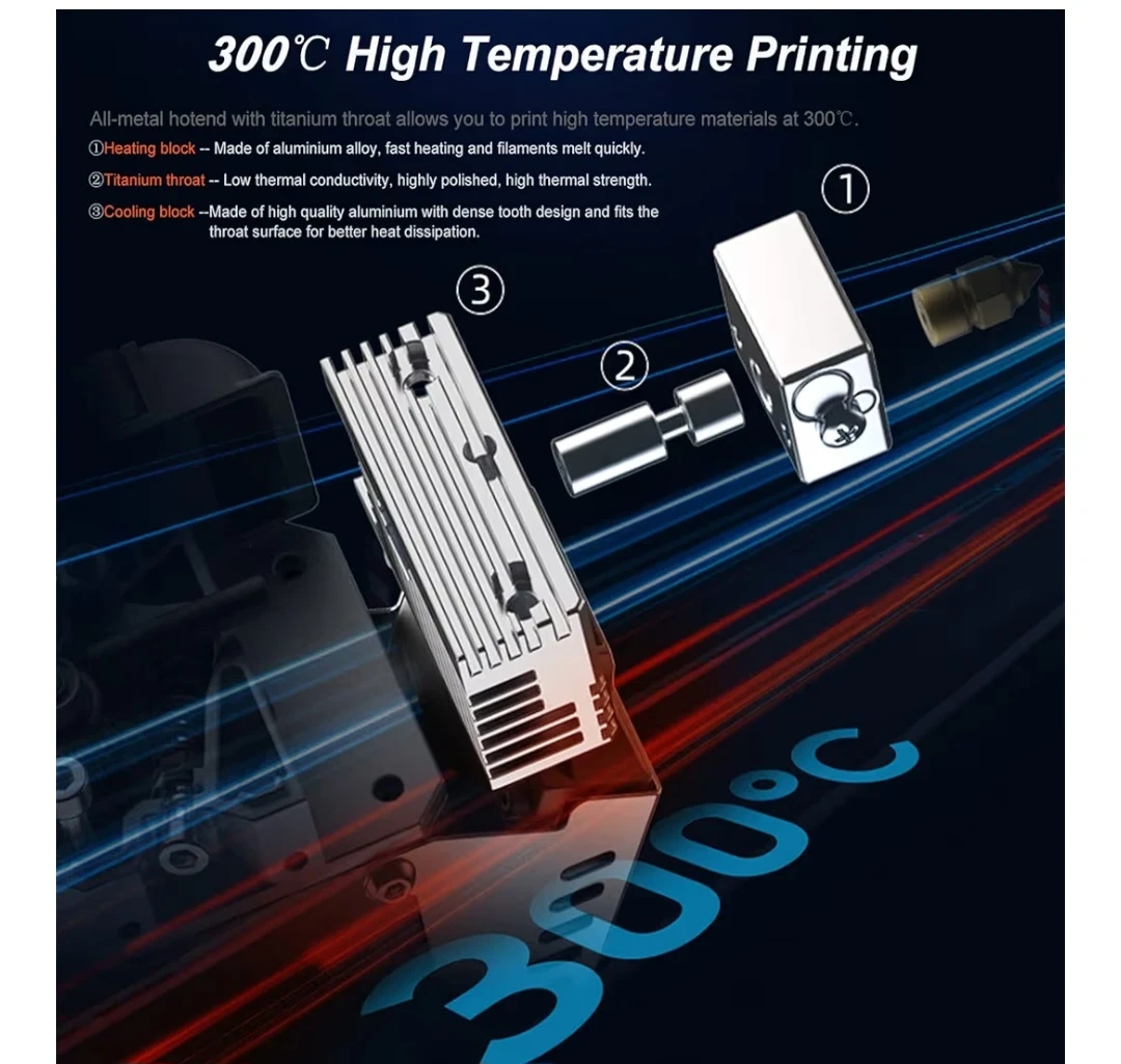 【300℃ Direct Extruder】All-metal hotend with titanium throat allows you to print high temperature materials at 300℃. Compatible with various filaments such as PLA, TPU, PETG, ABS, etc.