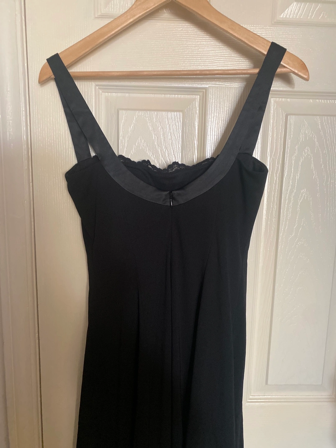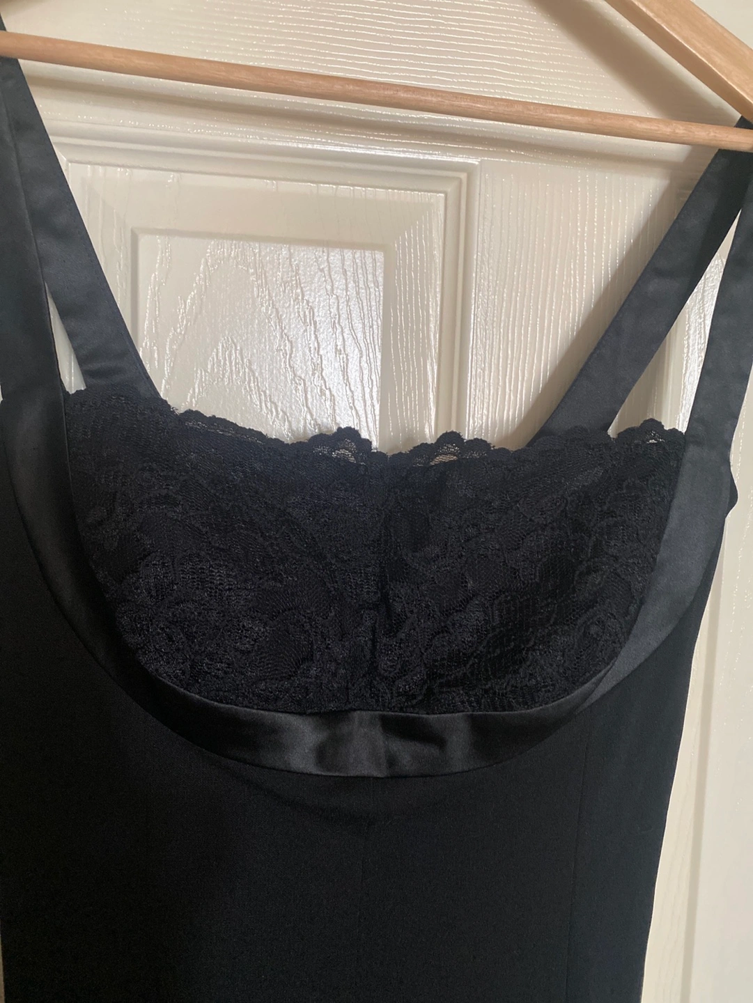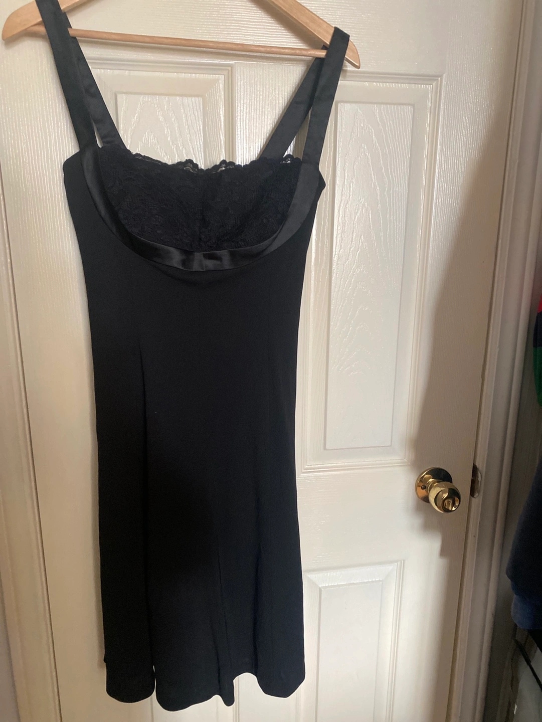 Black sleeveless slightly flare dress. Features a lace bodice and satin straps. Made in Canada. Size 2. 100% polyester.