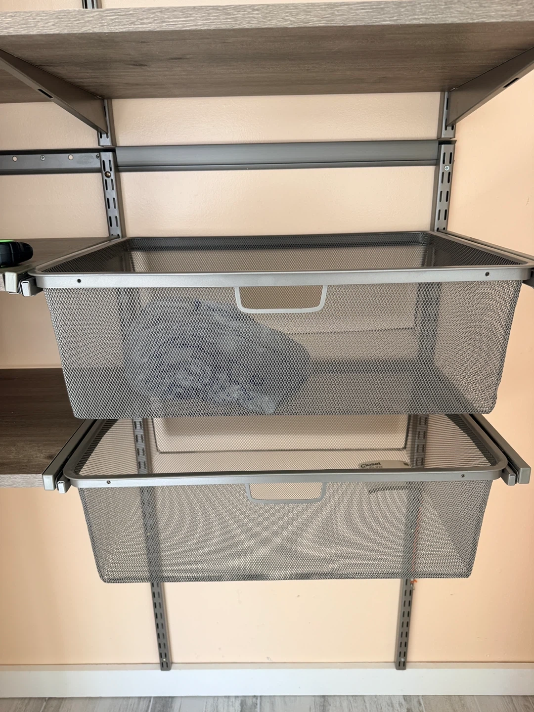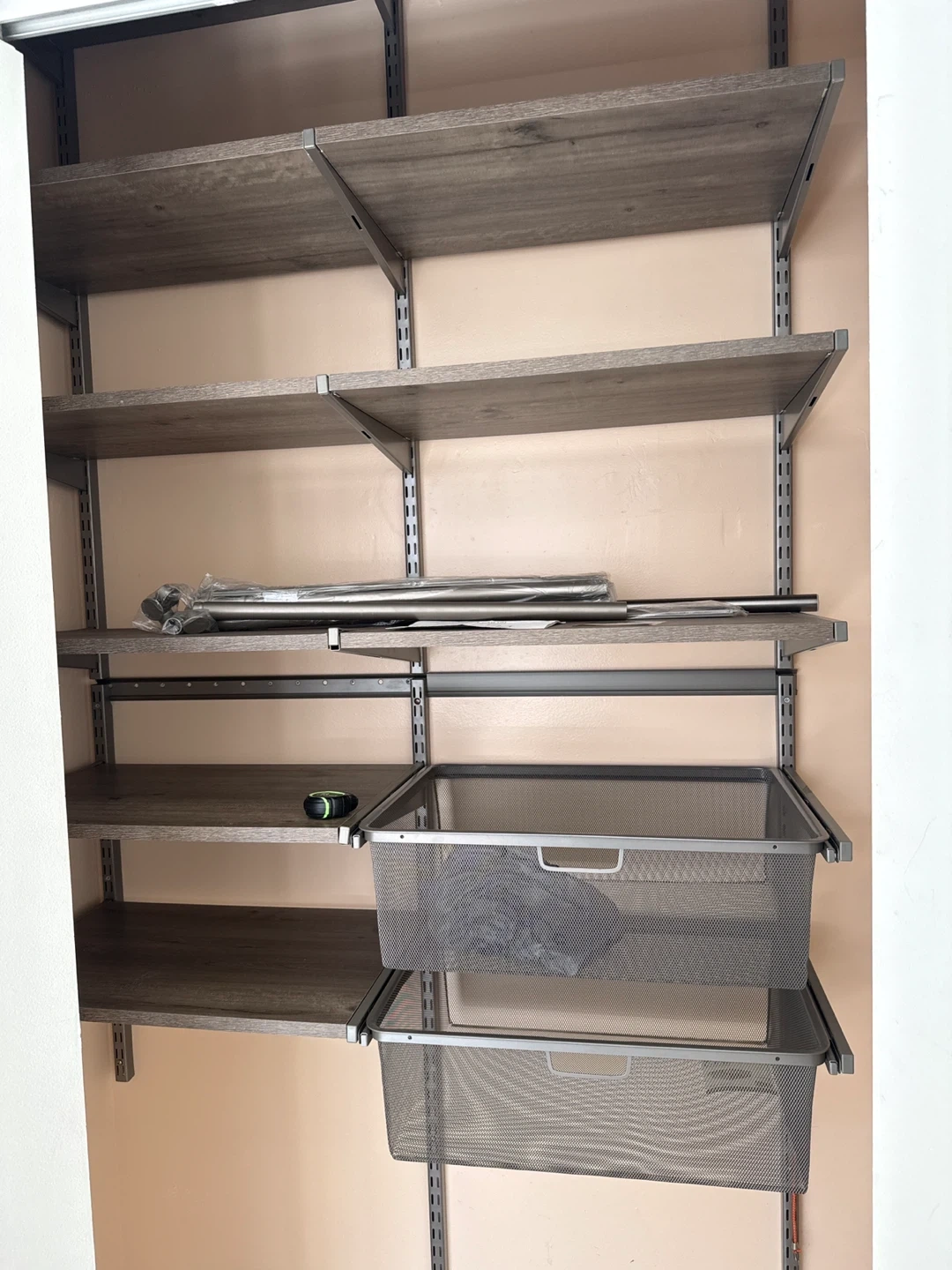 Customized closet system by Closet Culture in steel champagne. 10 shelves, 2 baskets, 3 vertical rails, 6 poles and more. You can also buy additional pieces currently on Amazon to create an incredible customized closet! We bought it for $750, pick up in Harlem 145th St. and St Nicholas.