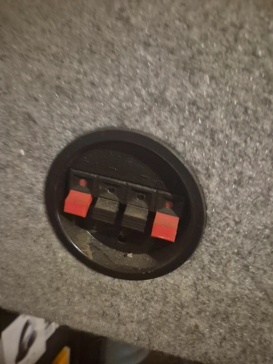 This speaker box includes two main speakers and a tweeter for great sound. It's covered in a grey felt material. The connectors on the back are binding posts.