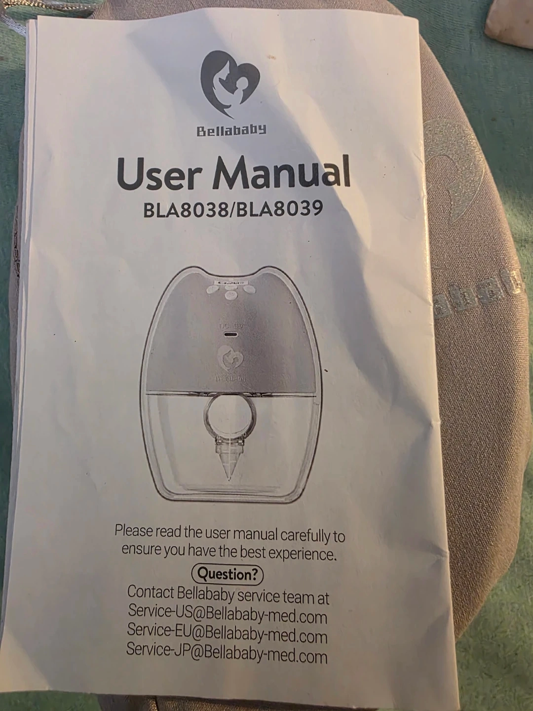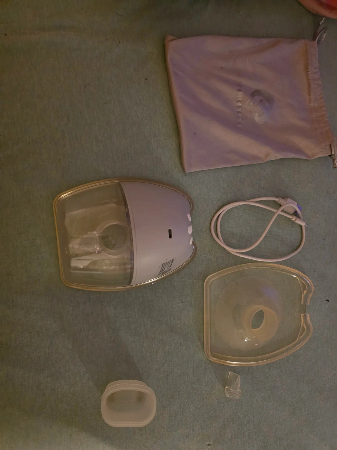 This is a Bellababy wearable breast pump, model BLA8038/BLA8039. It includes the main pump unit, a flange, a charging cable, and a storage bag. The pump is designed for discreet and convenient use. Used once just to test, everything brand new.