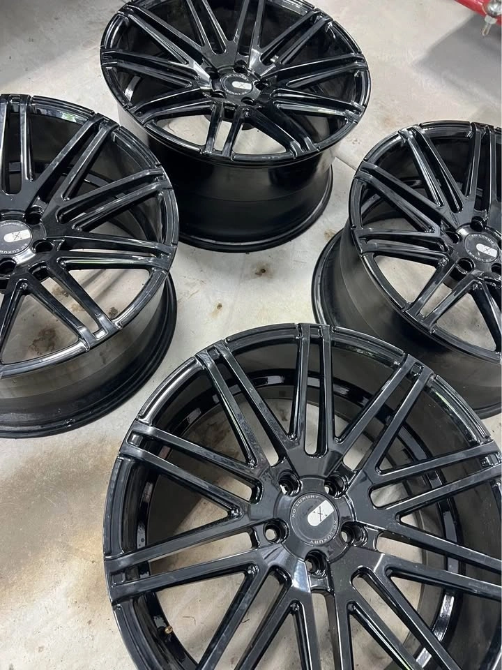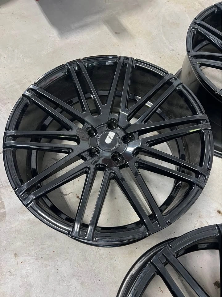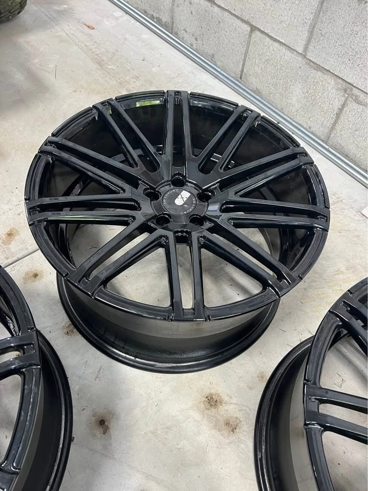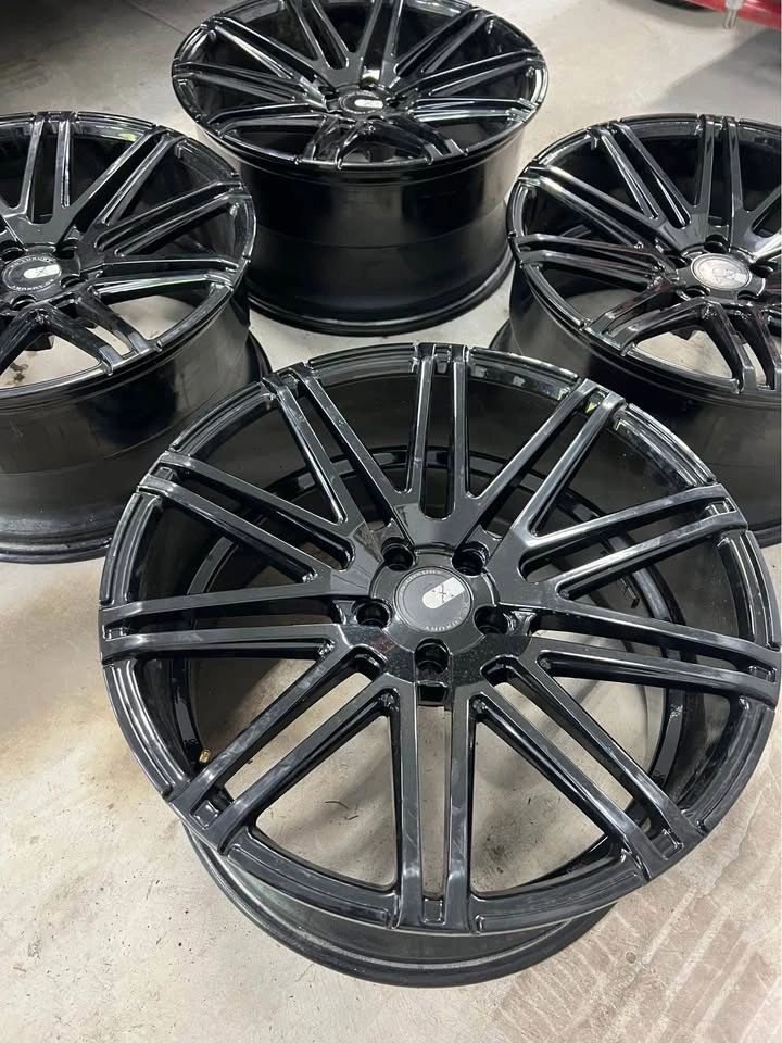 Freshly powder coated gloss black, no rash. One wheel was professionally welded. These 20" x 10" et30 wheels fit many 5x112 vehicles. Wheels only, no tires.