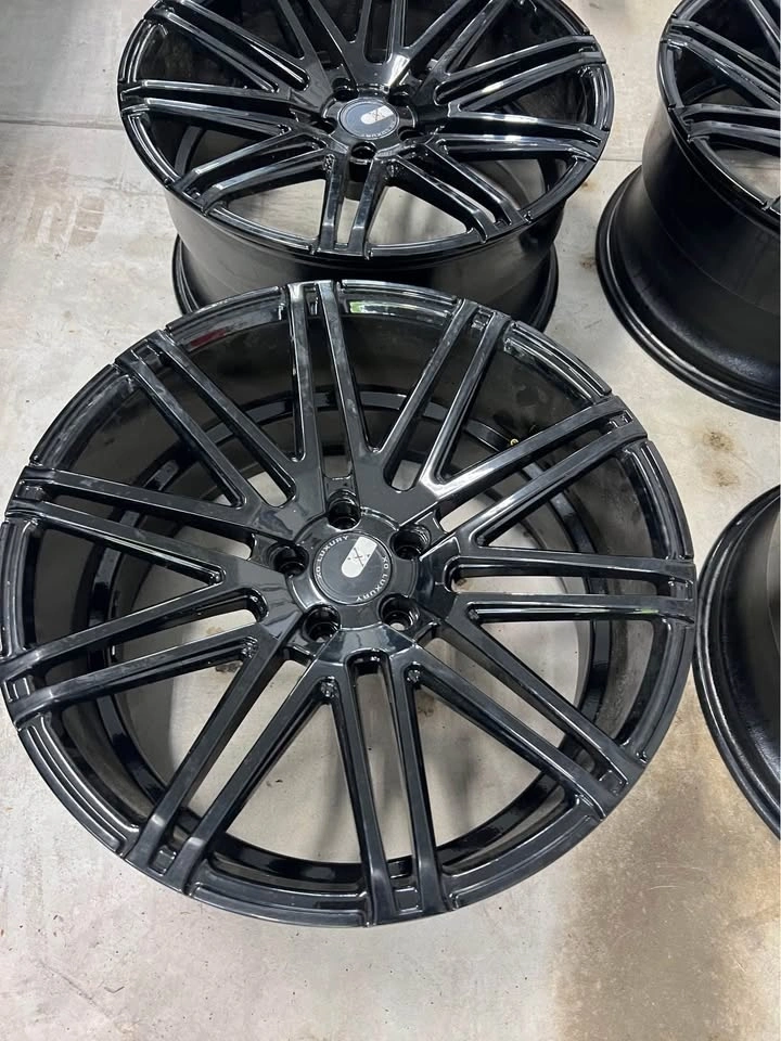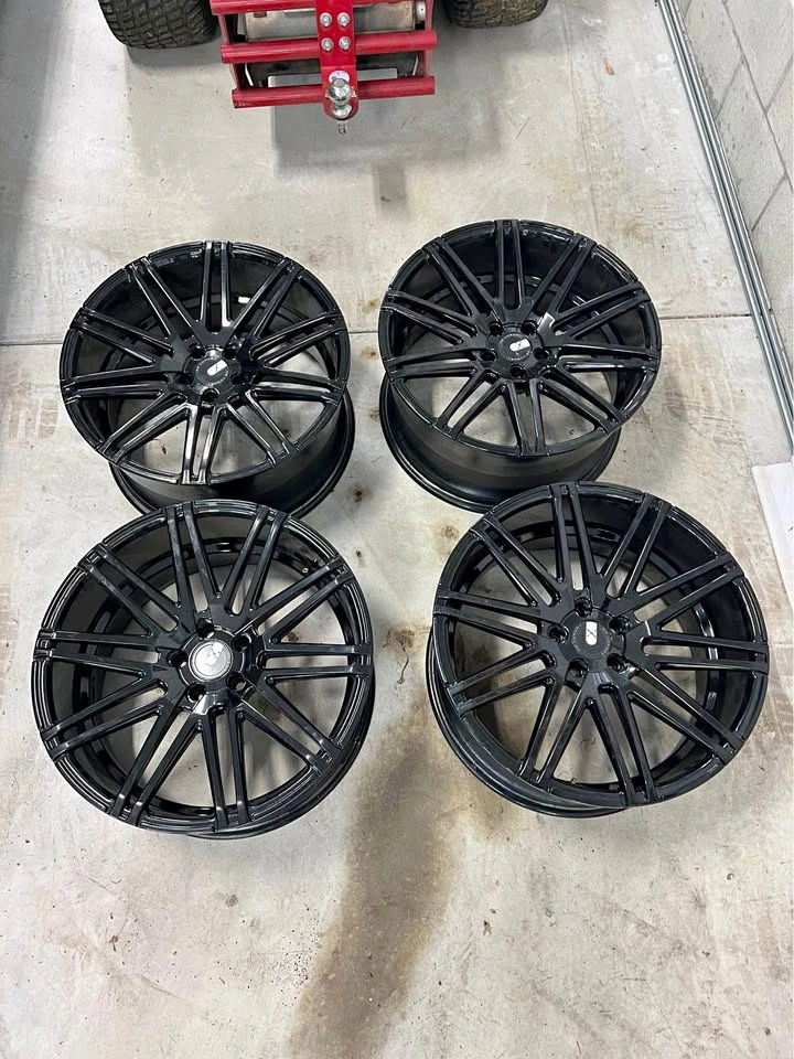 Freshly powder coated gloss black, no rash. One wheel was professionally welded. These 20" x 10" et30 wheels fit many 5x112 vehicles. Wheels only, no tires.