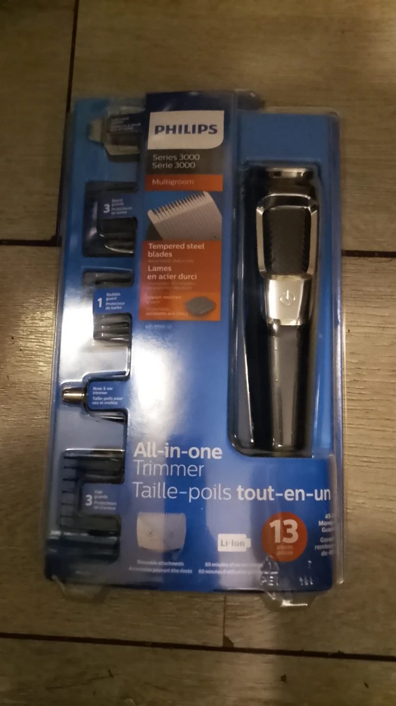 This Philips Series 3000 Multigroom is an all-in-one trimmer with tempered steel blades. It's powered by Li-Ion and offers 60 minutes of run time. It comes with 13 pieces, including hair guards and a nose & ear trimmer.