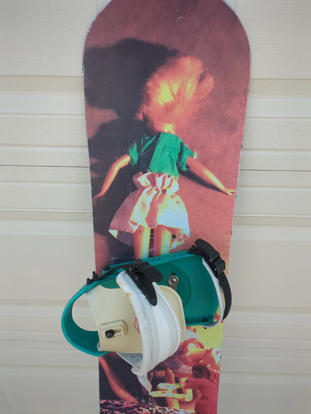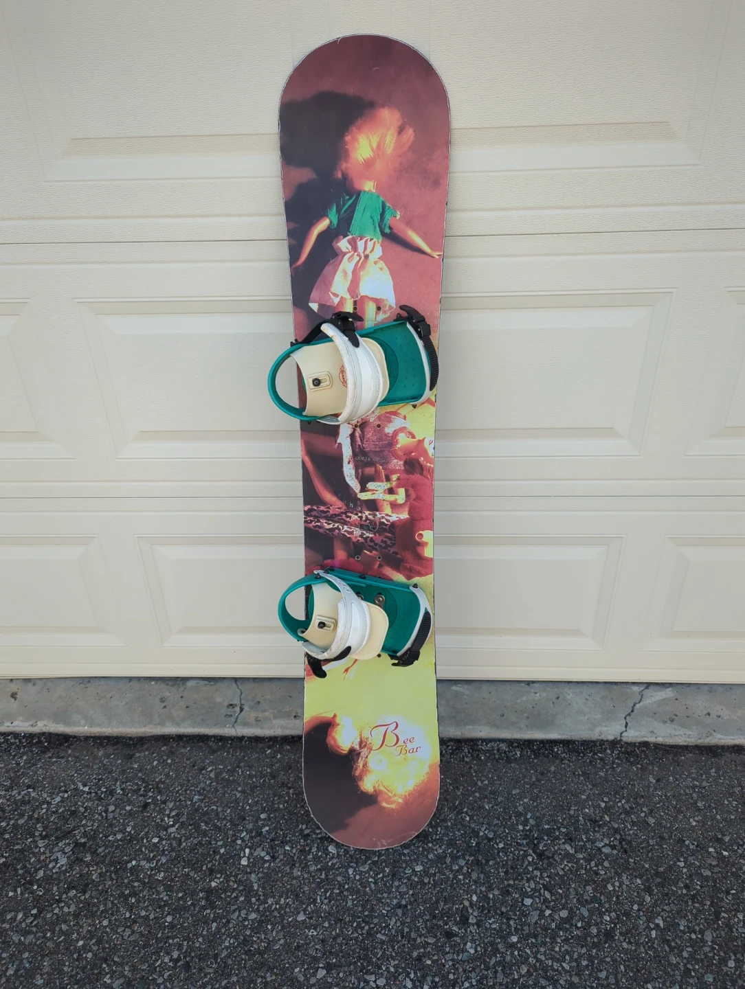 This is a Ride snowboard with bindings attached. It has a colourful graphic design on the underside. Bindings are adjustable for a secure fit.