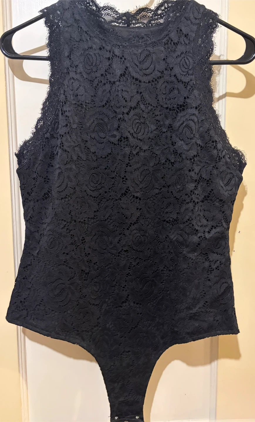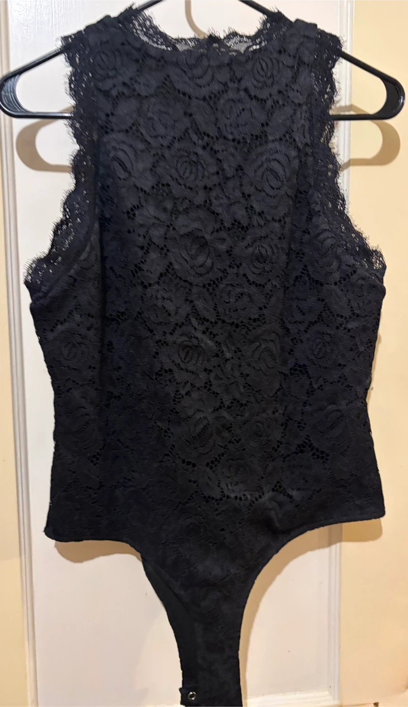 This is a black lace halter bodysuit. It's made of a stretchy lace material with a floral pattern. The neckline has a scalloped lace trim. Run small
