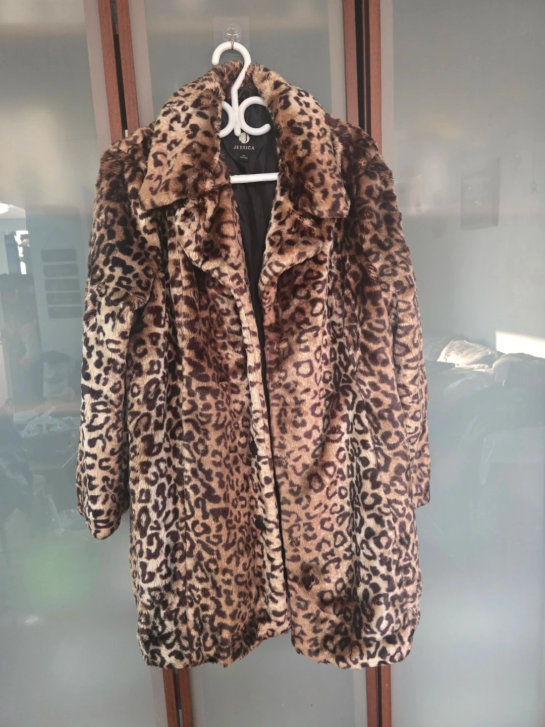 Jessica brand faux fur coat with a stylish leopard print. It's a cozy and fashionable outerwear piece. This coat is perfect for adding a touch of wild flair to any outfit!