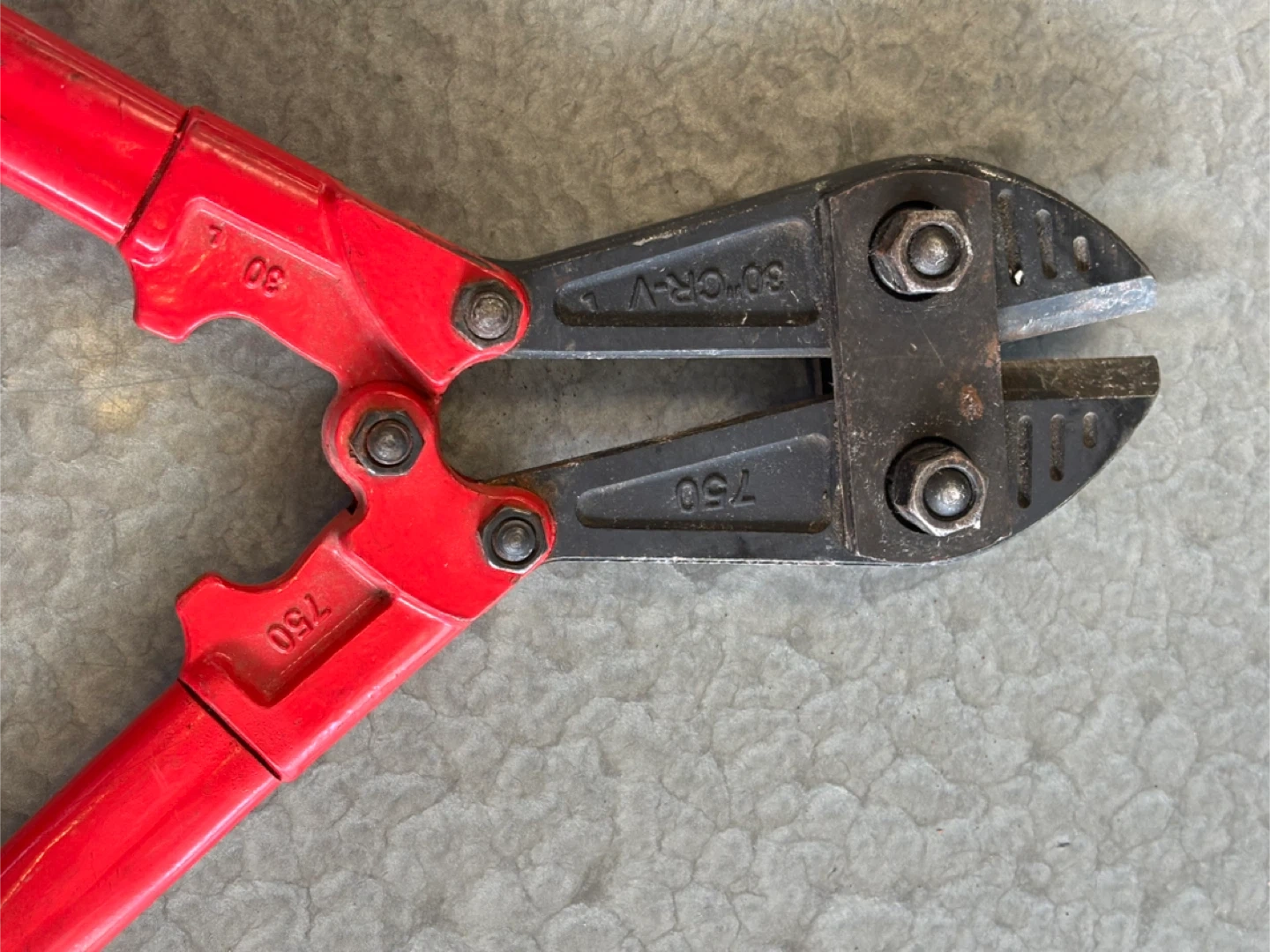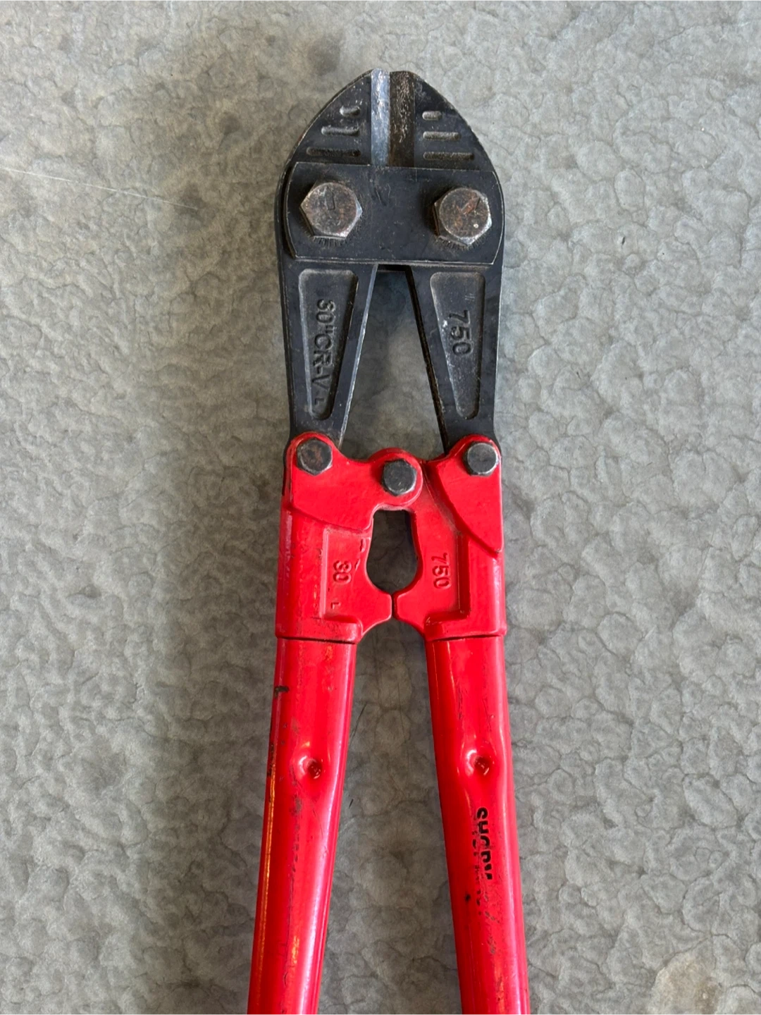 These are 30-inch bolt cutters with red handles and black grips. They're made from CR-V steel. These cutters are useful for cutting through chains, padlocks, and bolts.