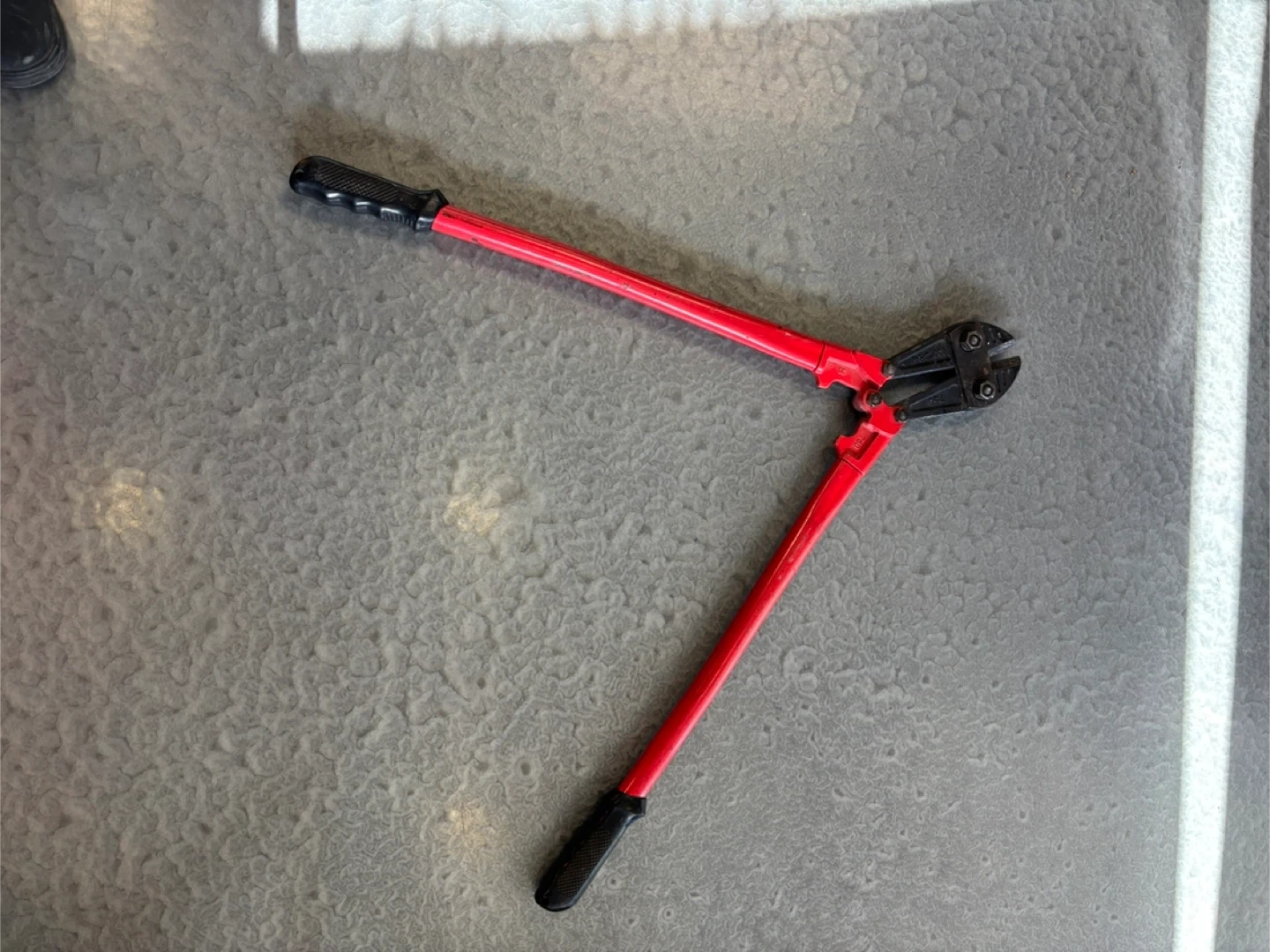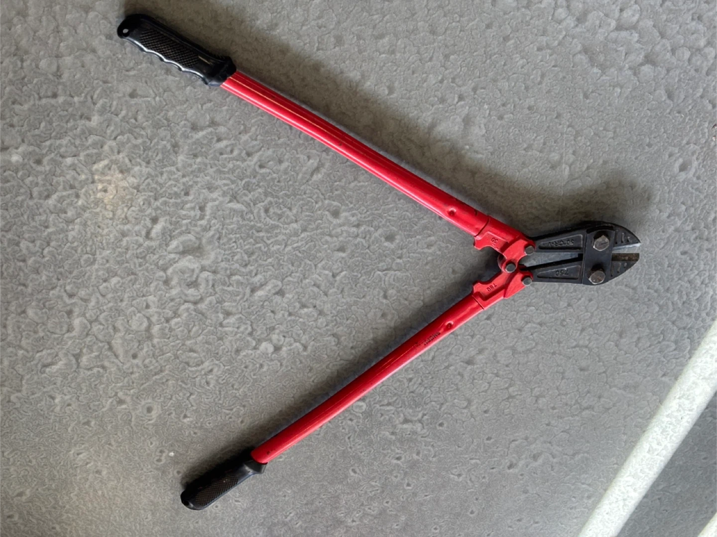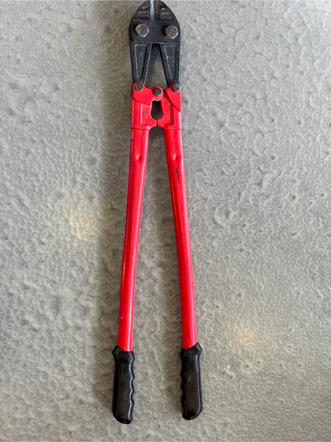 These are 30-inch bolt cutters with red handles and black grips. They're made from CR-V steel. These cutters are useful for cutting through chains, padlocks, and bolts.