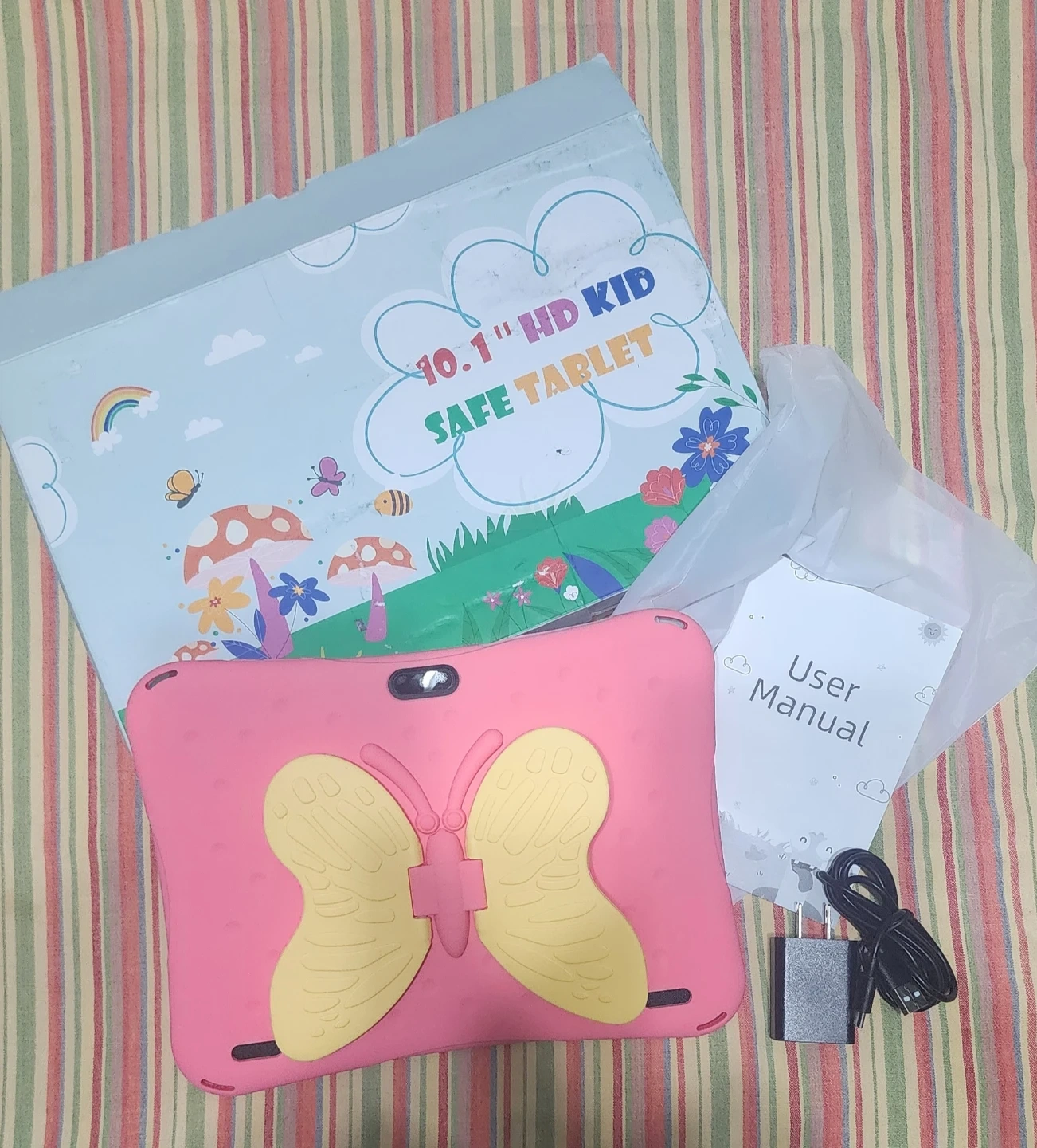 Selling a 10.1" HD Kid Safe Tablet in pink. It comes with the original box, user manual, and charger. Perfect for keeping the little ones entertained!