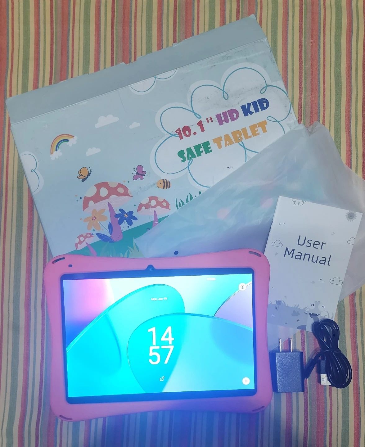 Selling a 10.1" HD Kid Safe Tablet in pink. It comes with the original box, user manual, and charger. Perfect for keeping the little ones entertained!