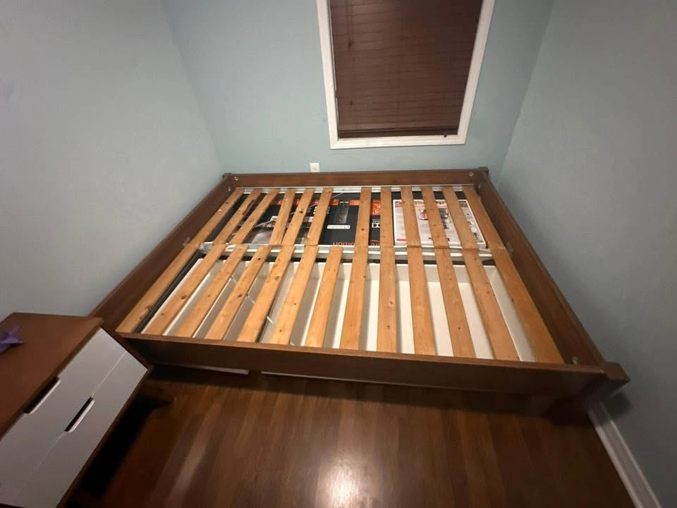 Queen size wooden bed-frame. It is in very good condition, does not squeak or rock. Has slight imperfections.