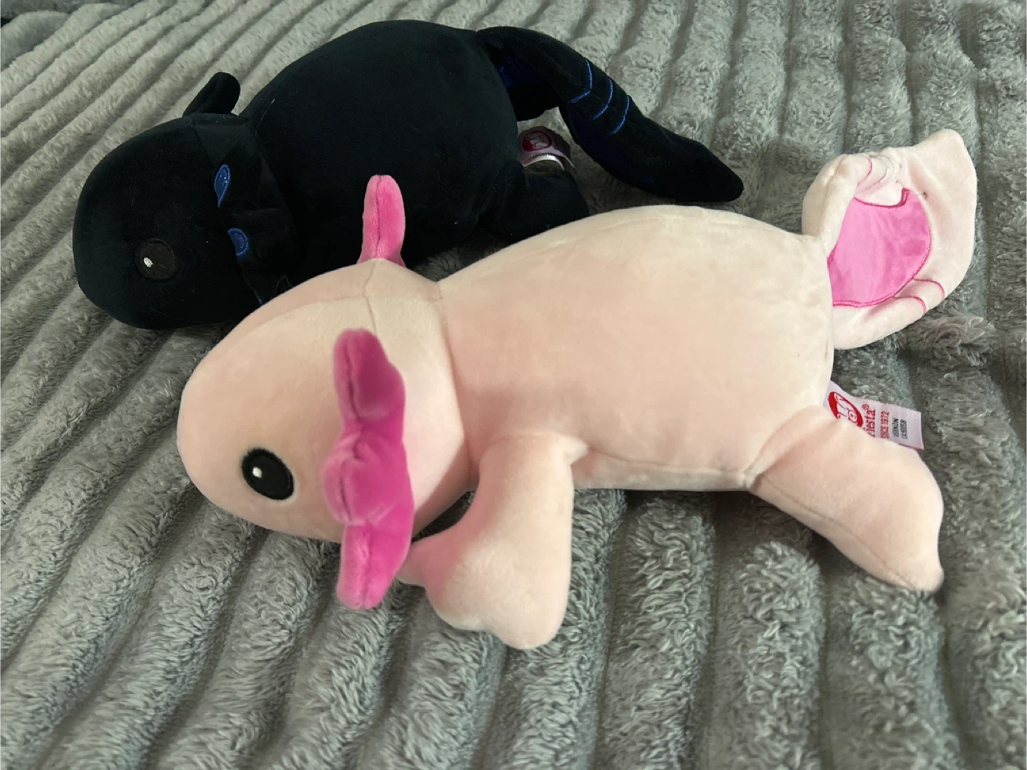 Two cute axolotl plush toys, one pink and one black. They're soft and cuddly! Got these originally for 20 EACH.