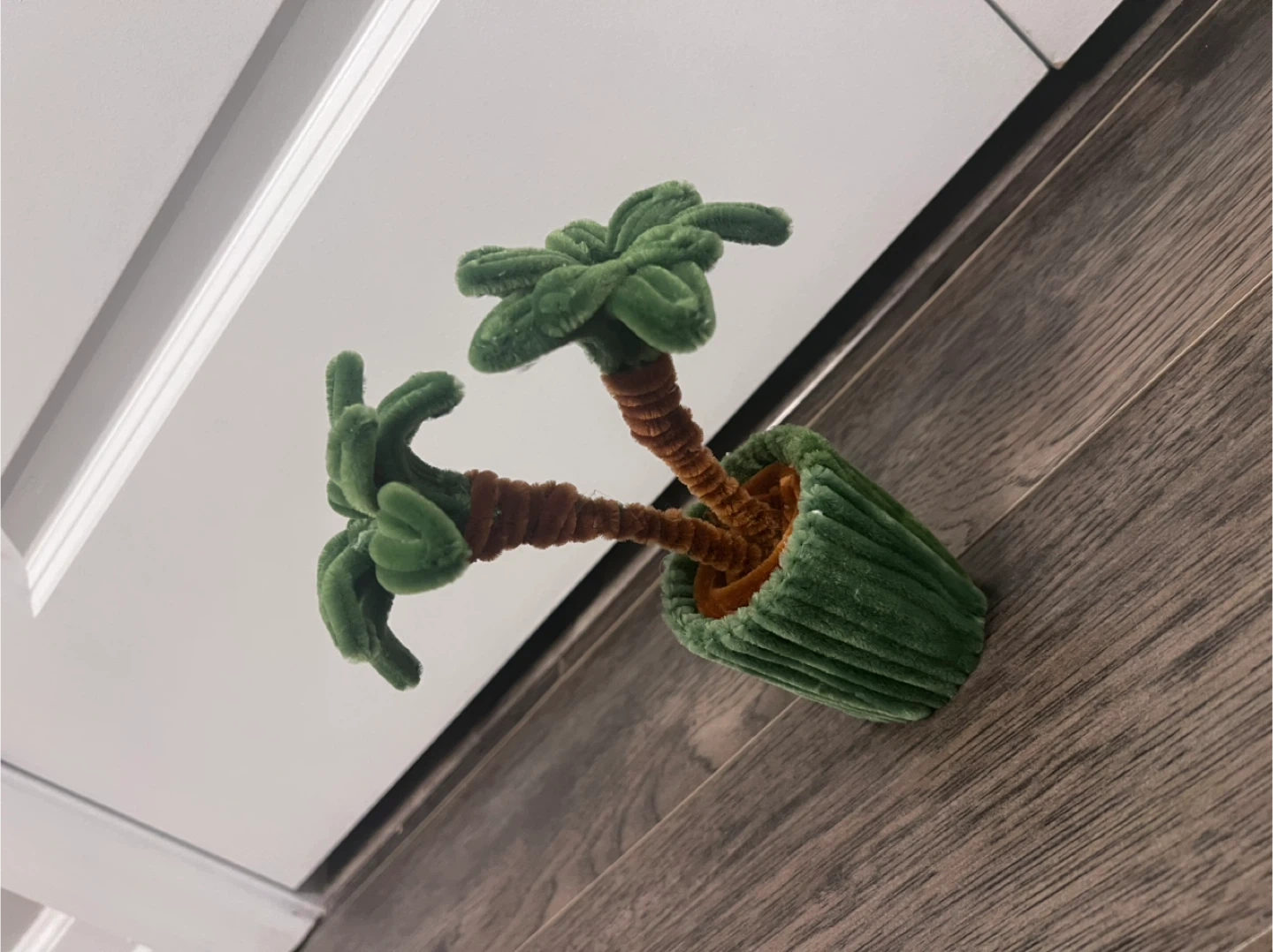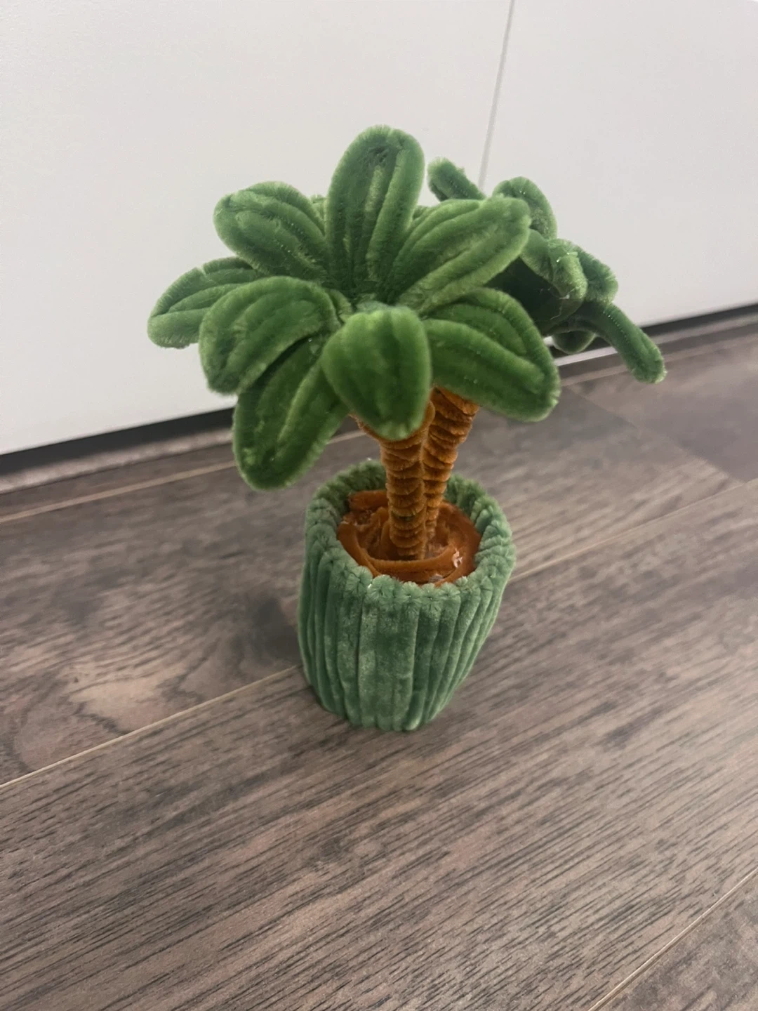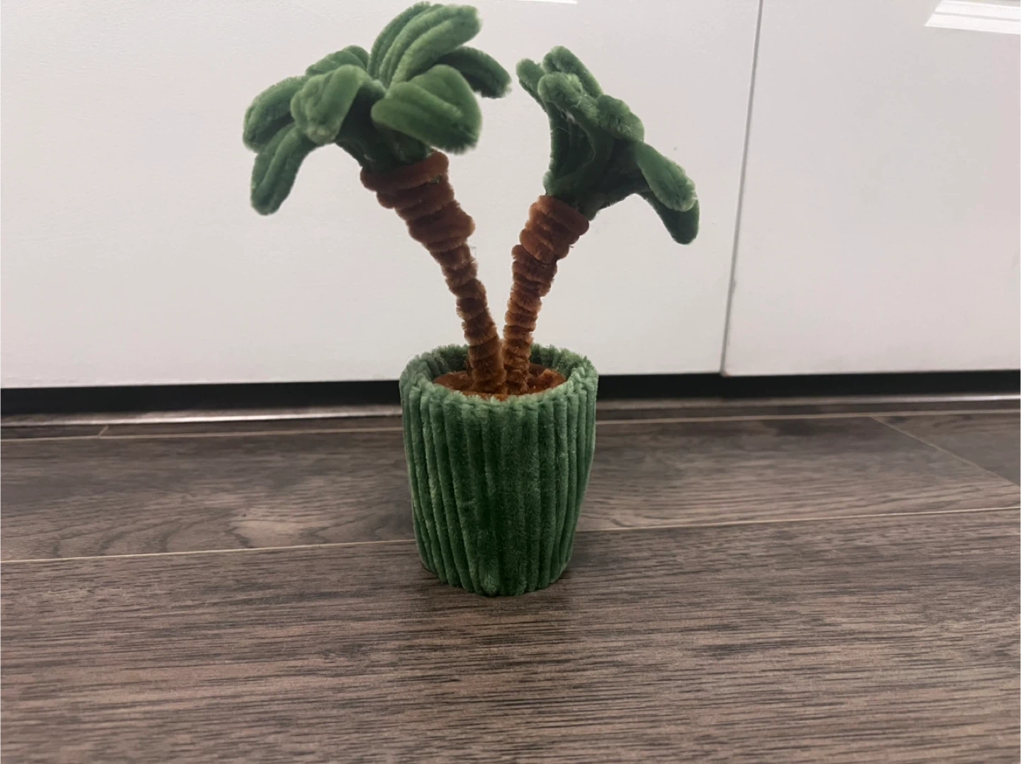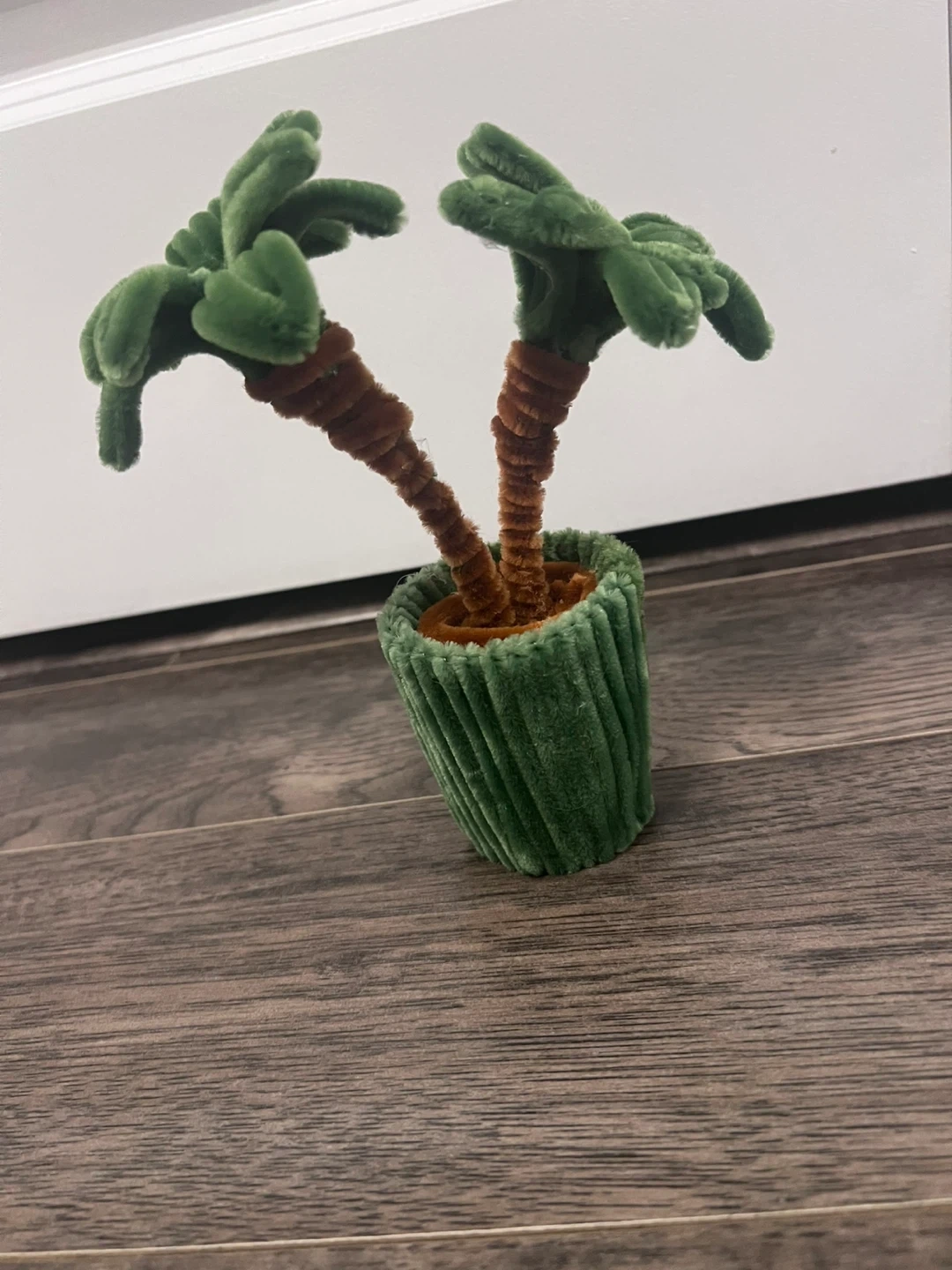 Cute pipe cleaner palm tree in a fuzzy green pot. Adds a touch of tropical flair to any space. It's great for desks or shelves!