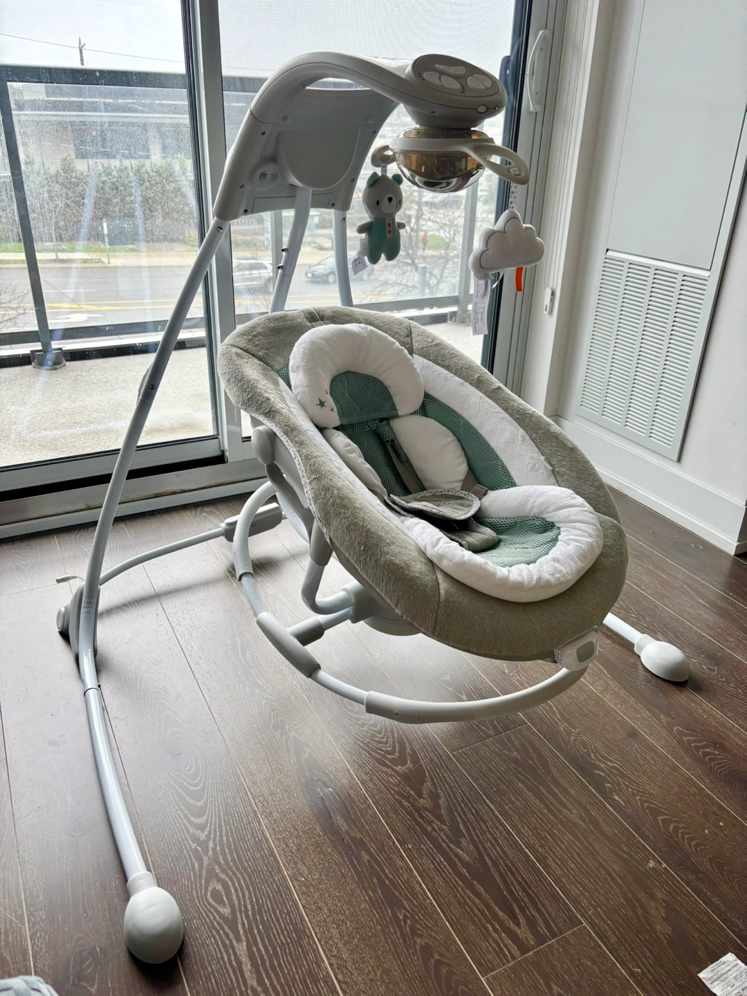 Baby swing, grey and green colour scheme. Features multiple settings, including swinging, vibration, and sounds. Mobile with plush toys included. Gently used. Original price $242.91