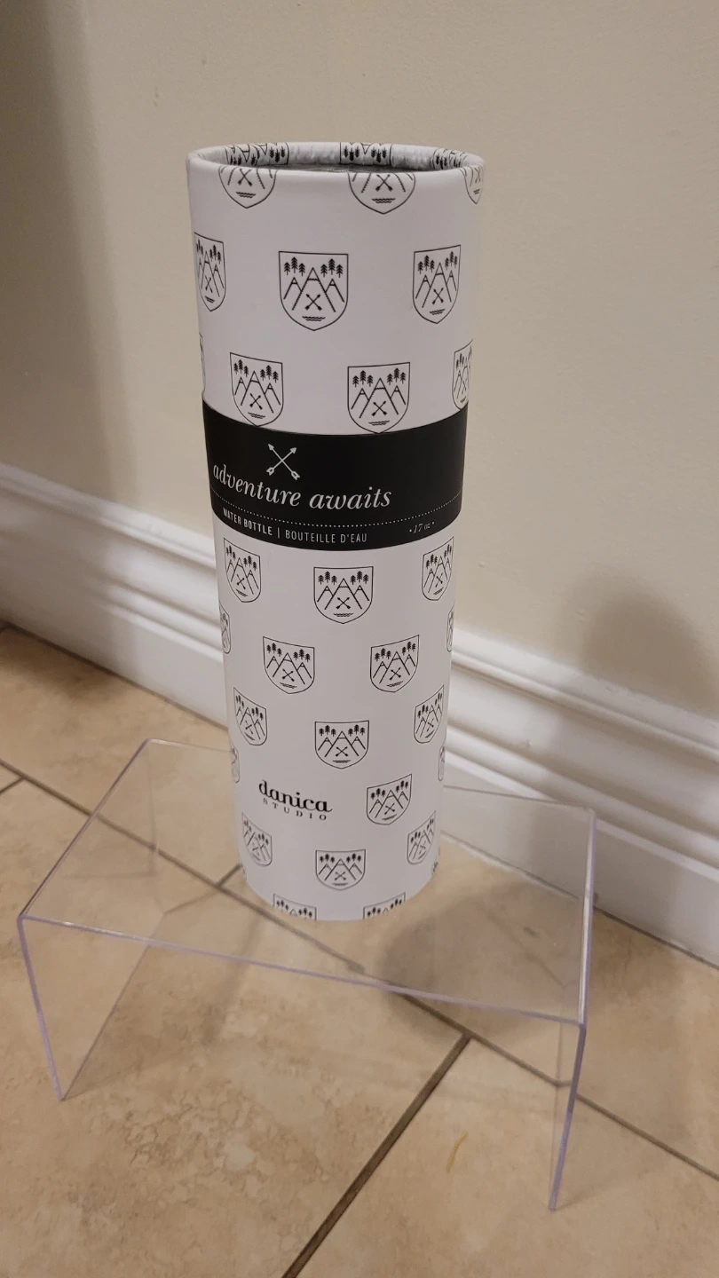 This Danica Studio water bottle features the 'Adventure Awaits' design. It's a reusable water bottle perfect for staying hydrated on the go. Comes in its original packaging tube.