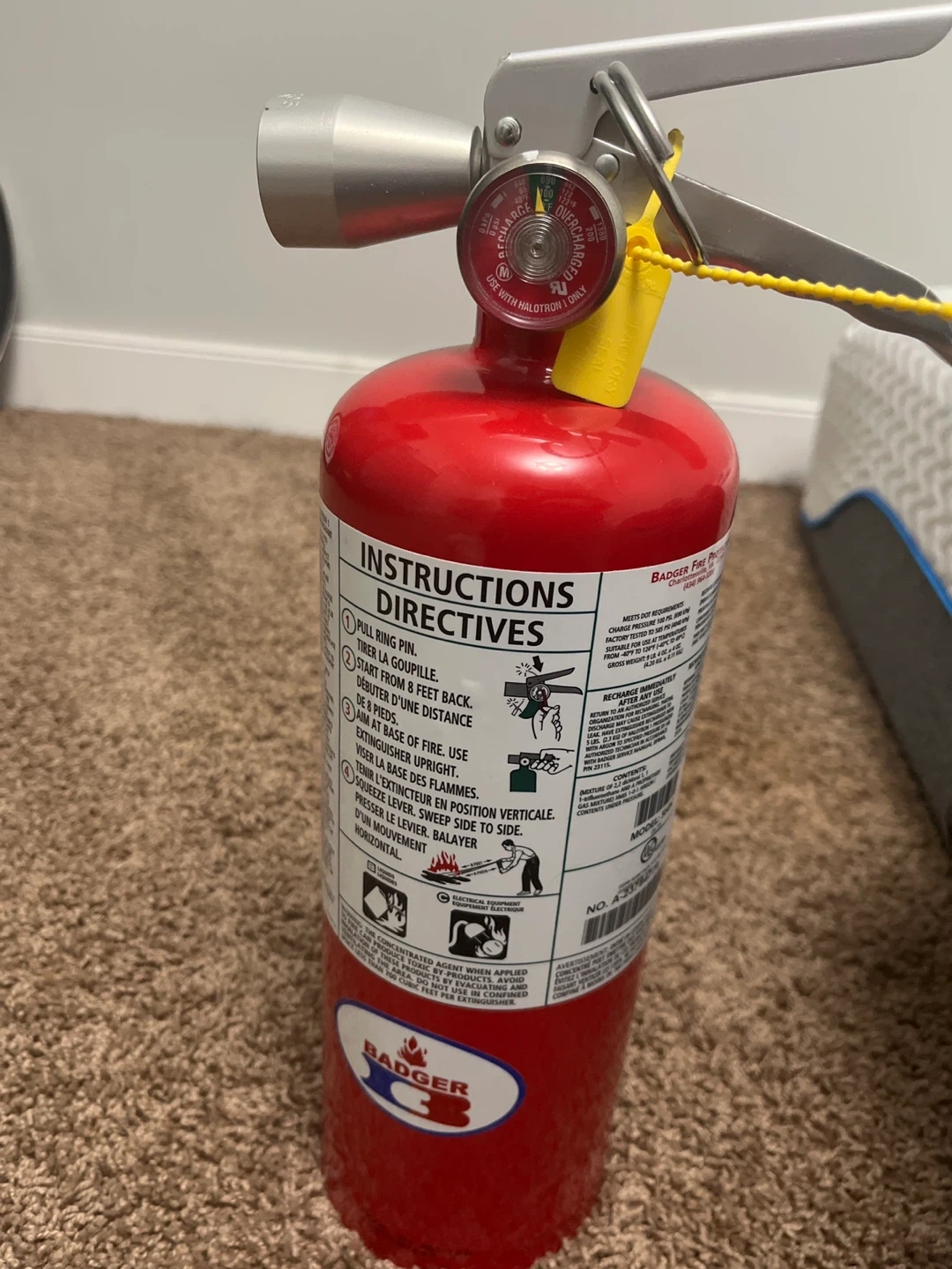 This is a red Badger fire extinguisher. It's a Halotron 1 model. Instructions for use are printed on the side. This extinguisher is great for providing fire safety.