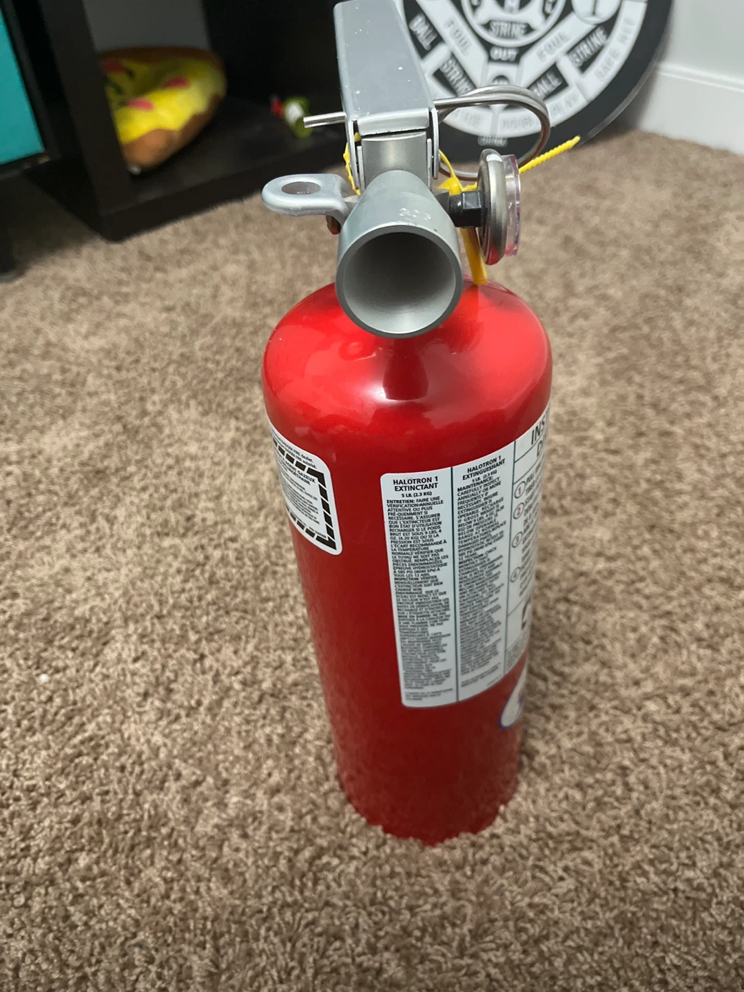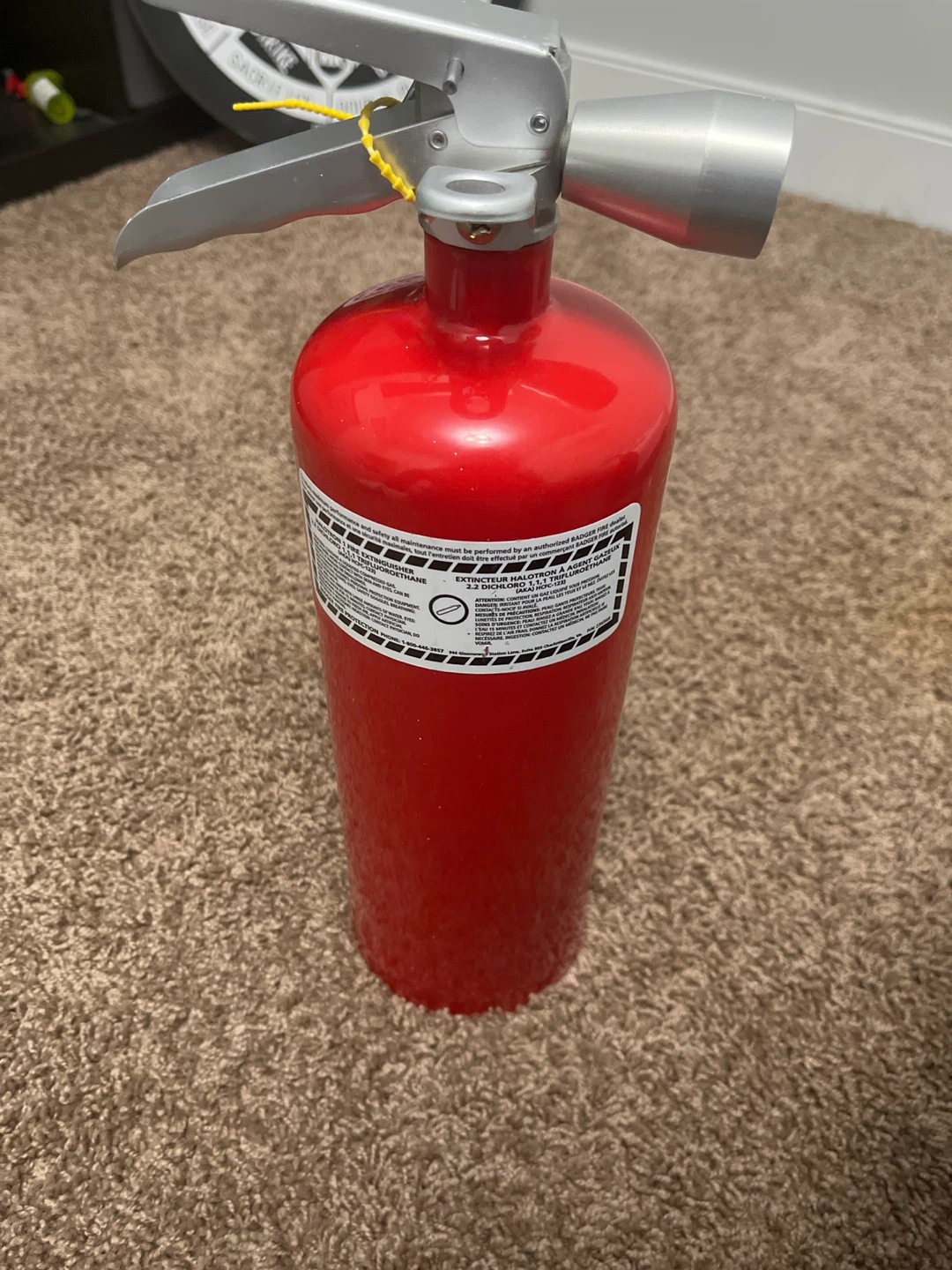 This is a red Badger fire extinguisher. It's a Halotron 1 model. Instructions for use are printed on the side. This extinguisher is great for providing fire safety.