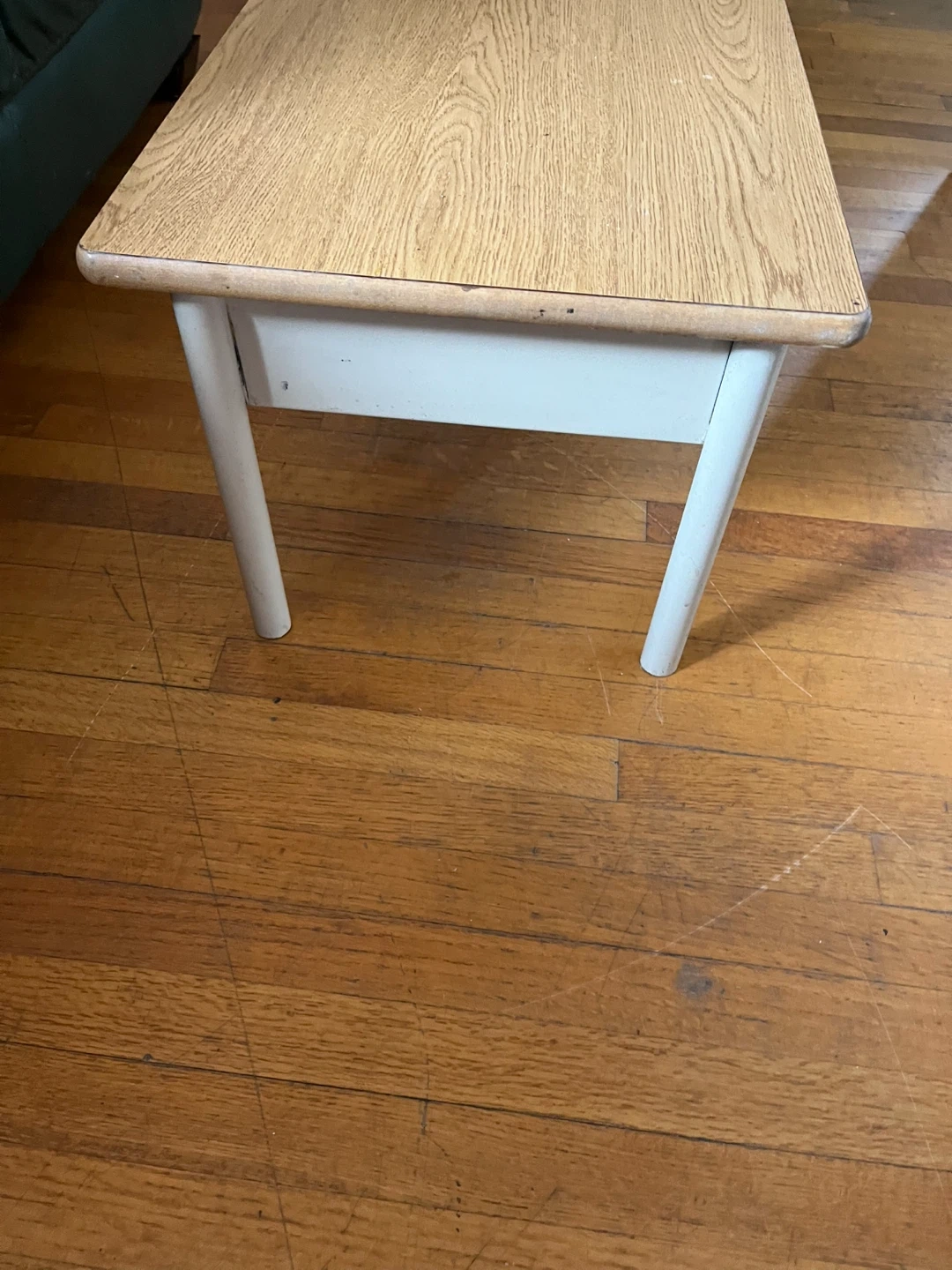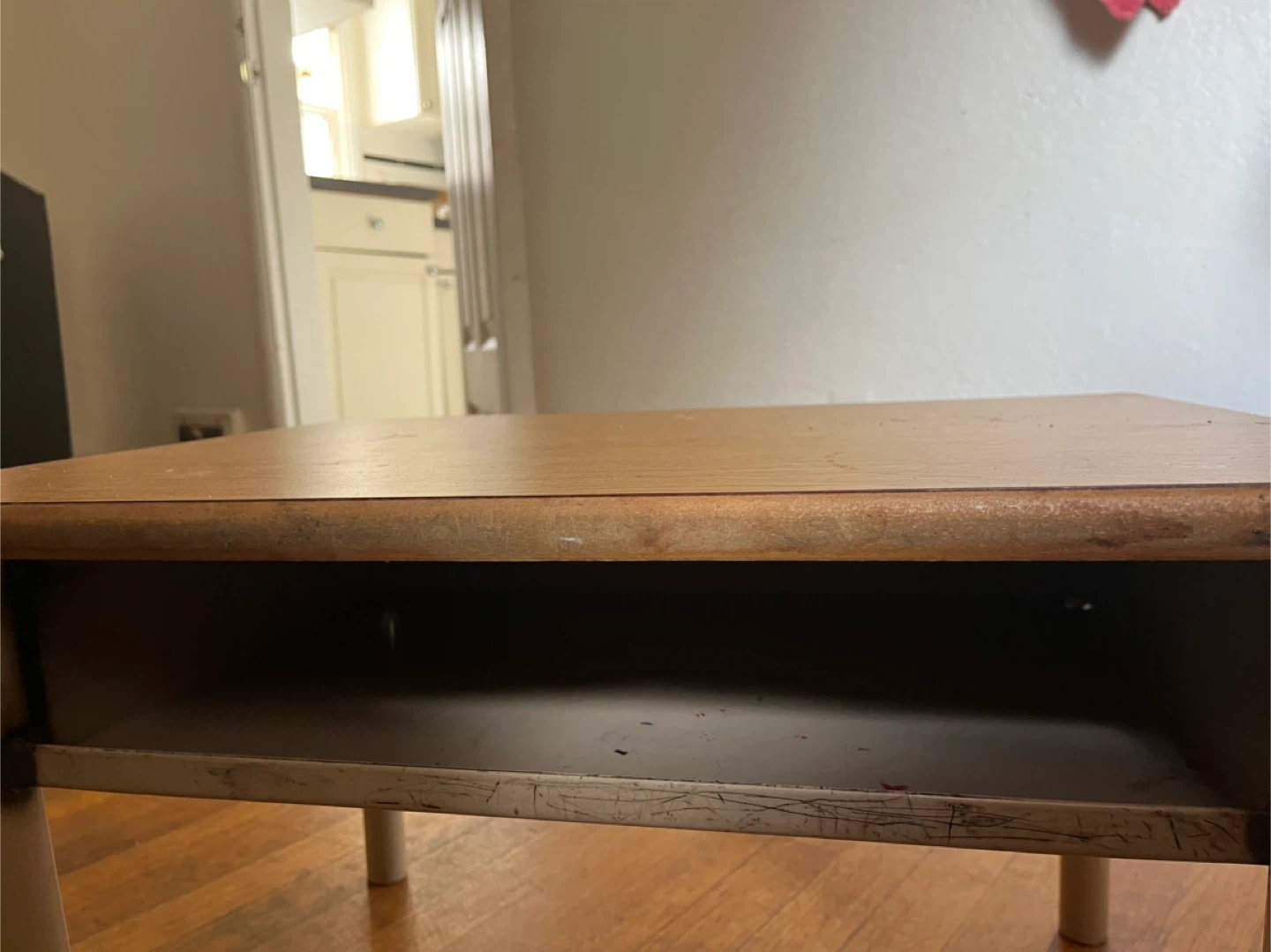 This is a small side table with a wood-look top and a white drawer. It has metal legs and a simple design. Useful for small spaces or as an end table next to a couch.