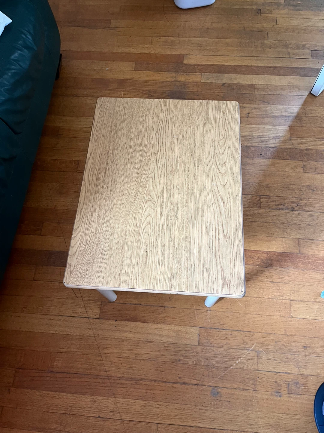This is a small side table with a wood-look top and a white drawer. It has metal legs and a simple design. Useful for small spaces or as an end table next to a couch.