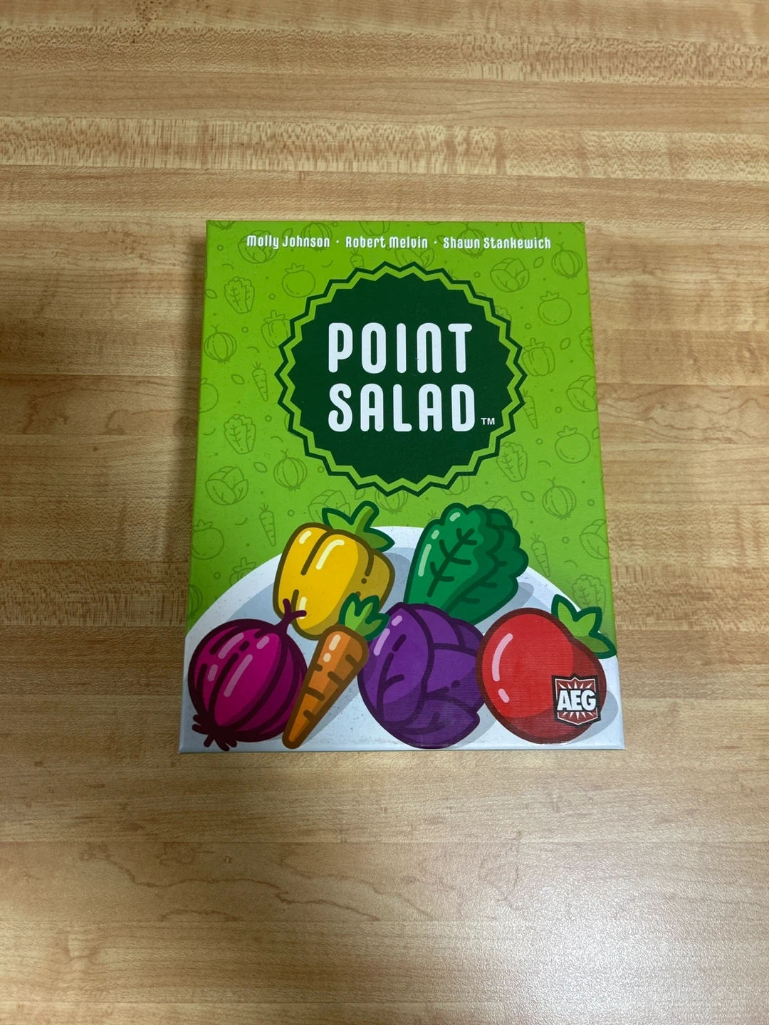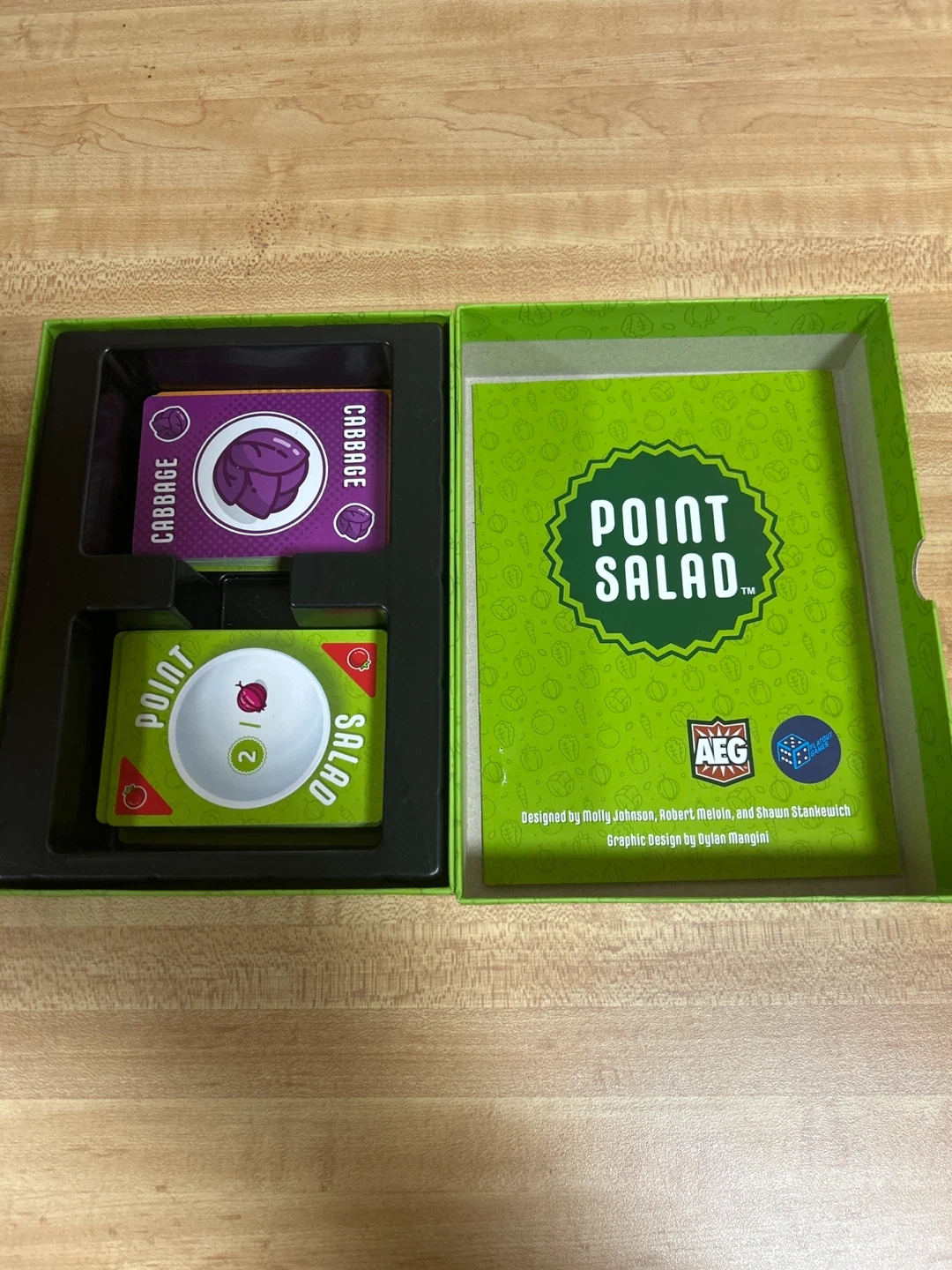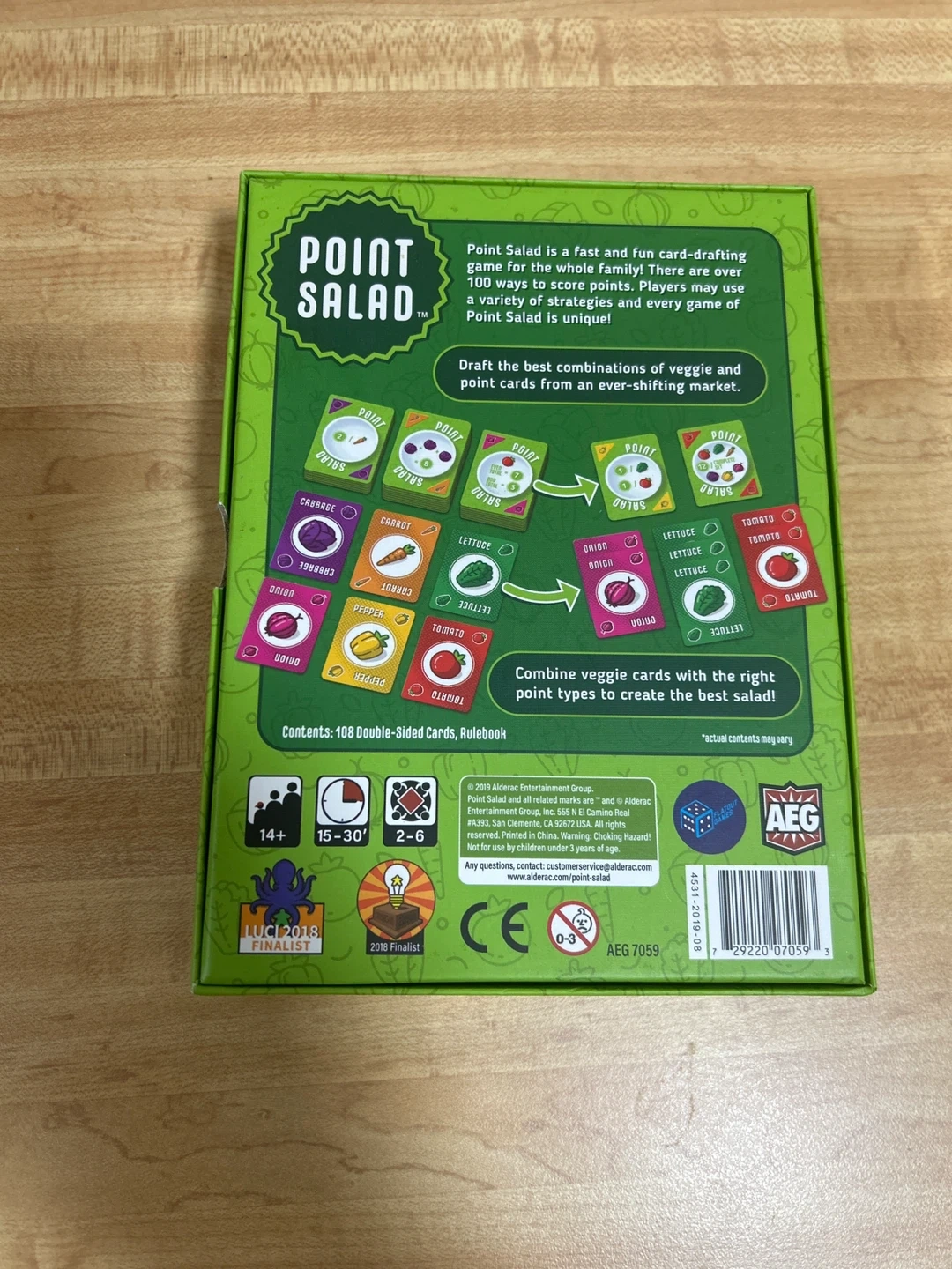 Point Salad is a fast and fun card-drafting game for the whole family! There are over 100 ways to score points. Point Salad is unique! Combine veggie cards with the right point types to create the best salad! Contents: 108 Double-Sided Cards, Rulebook