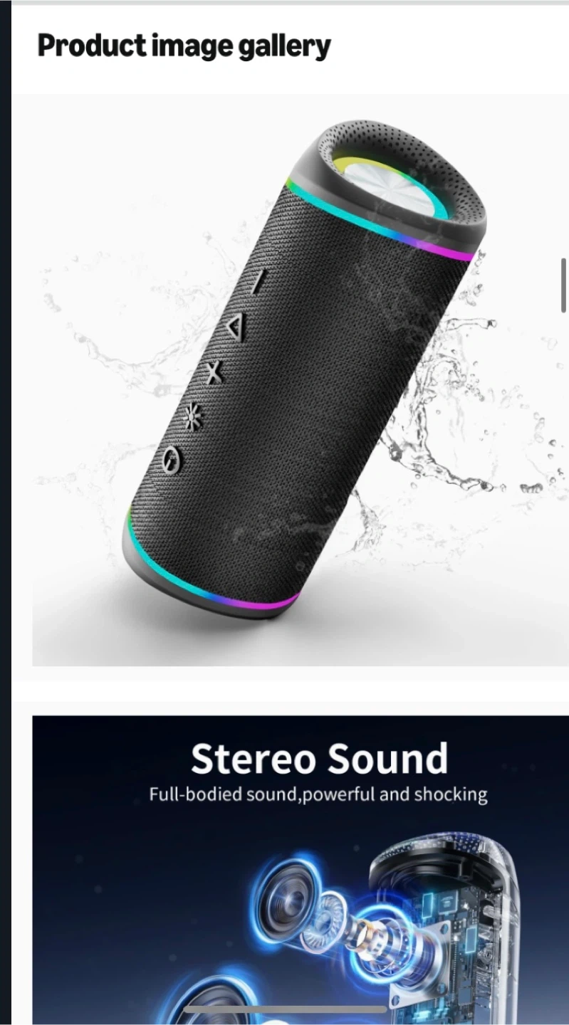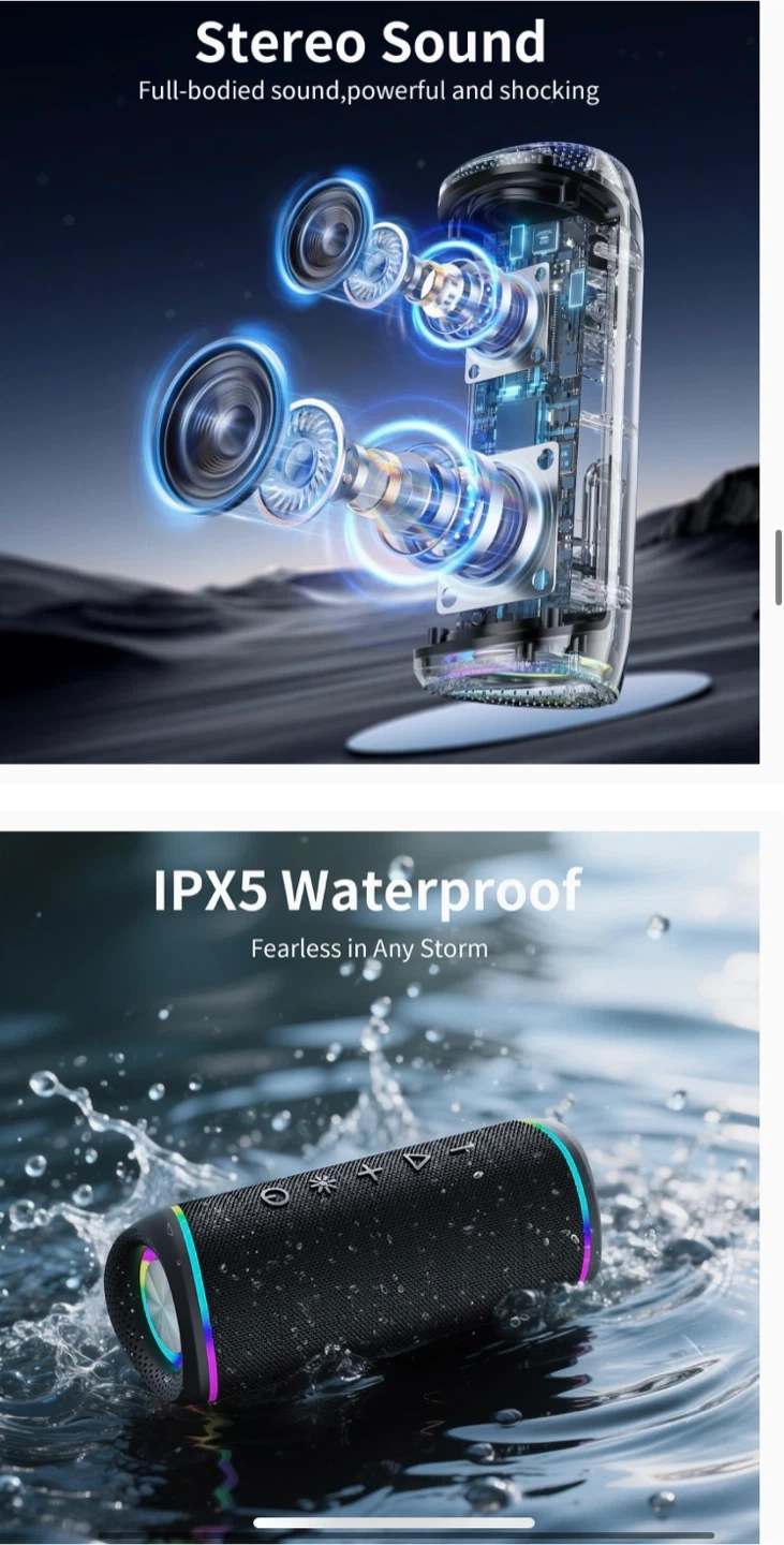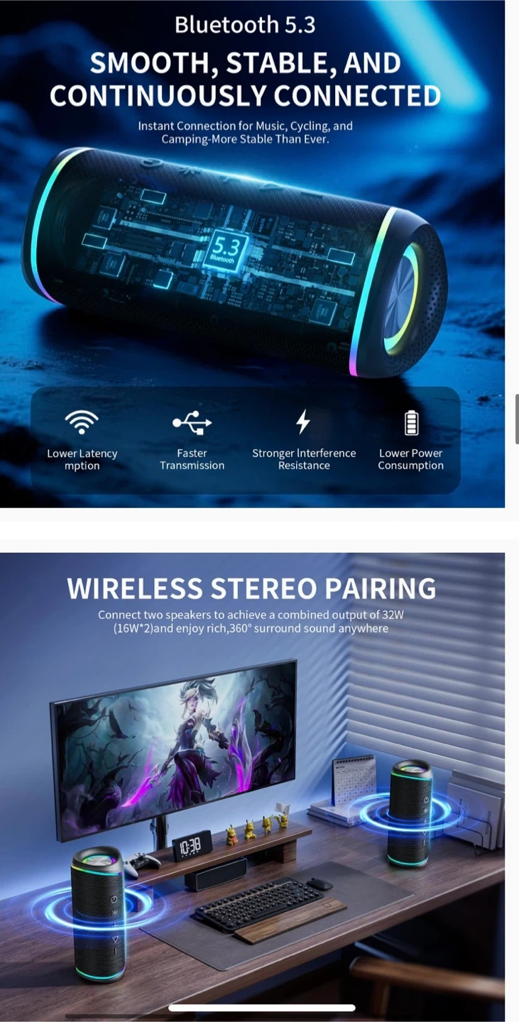 This is an RGB EBS-609 wireless speaker with Bluetooth 5.3 connectivity. It's IPX5 waterproof for use in various conditions. Enjoy stereo sound with a charge time of less than 2 hours. Supports wireless stereo pairing for a combined output of 32W.