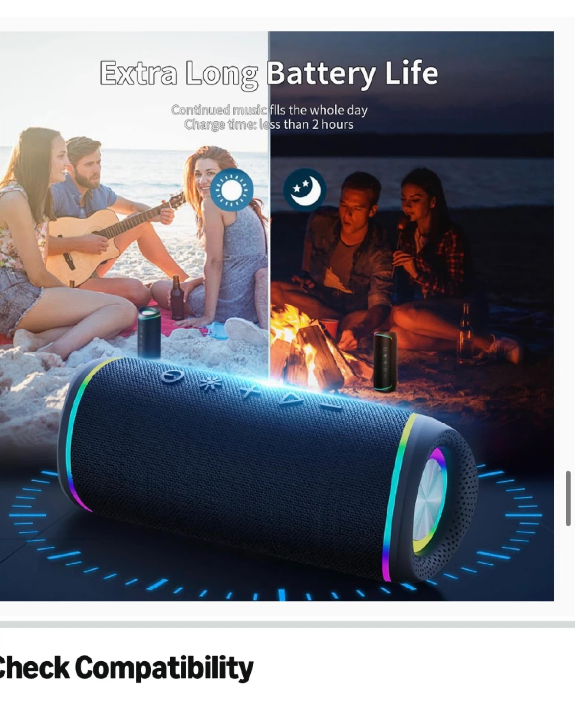 This is an RGB EBS-609 wireless speaker with Bluetooth 5.3 connectivity. It's IPX5 waterproof for use in various conditions. Enjoy stereo sound with a charge time of less than 2 hours. Supports wireless stereo pairing for a combined output of 32W.