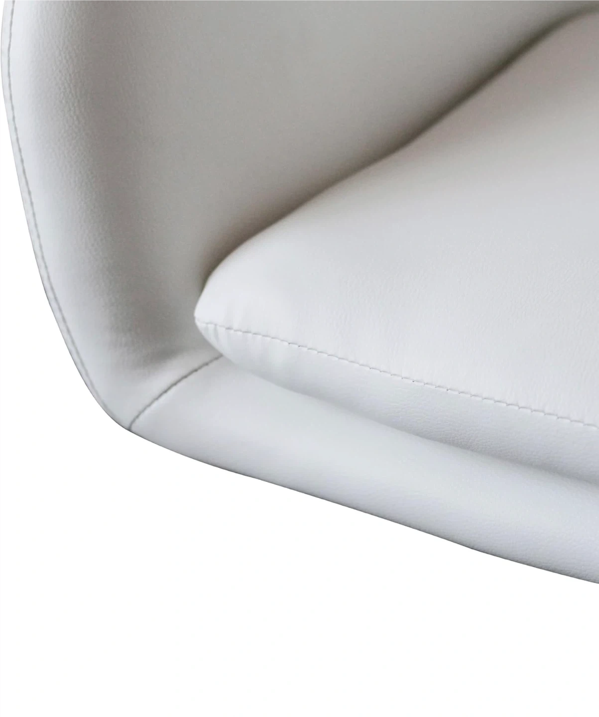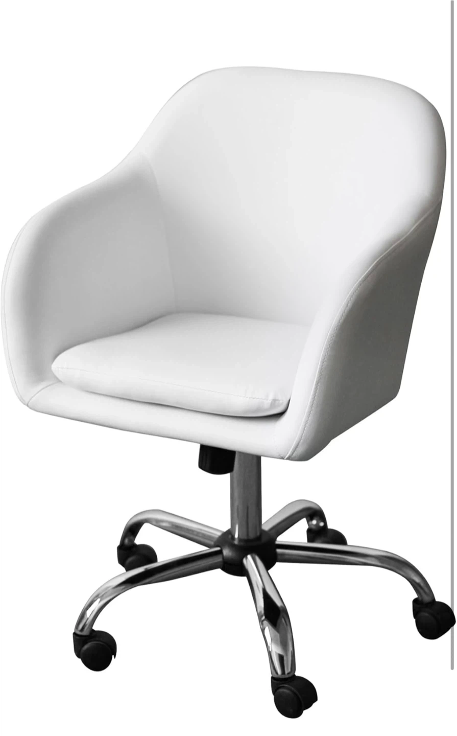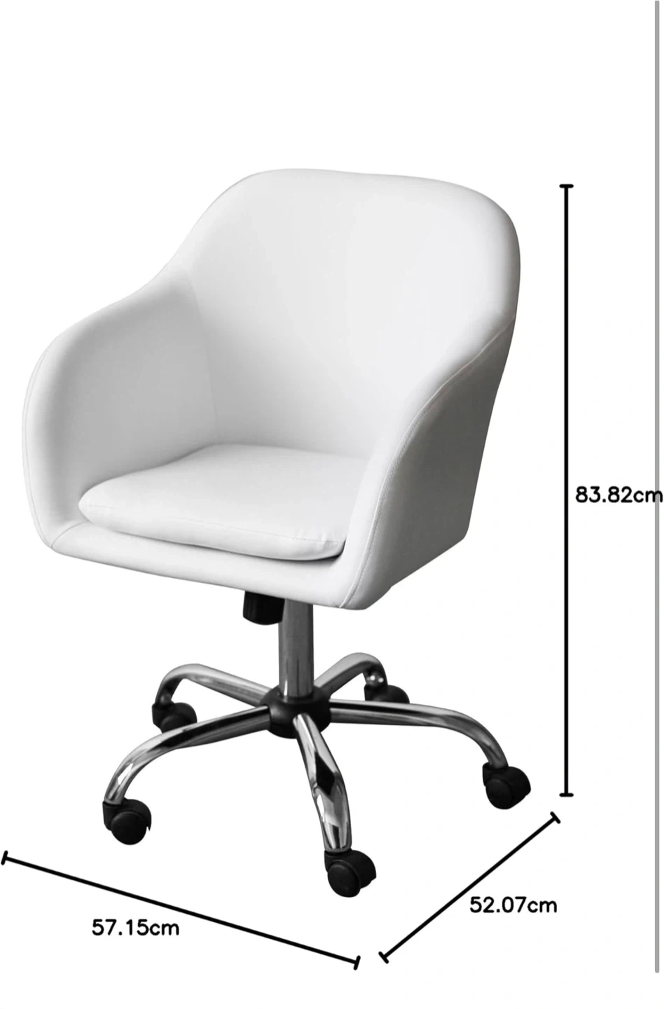 This is a white office chair with a rolling base and adjustable height. It's made of faux leather. The chair measures 83.82cm high, 57.15cm wide, and 52.07cm deep. This chair is handy for home offices or workspaces!