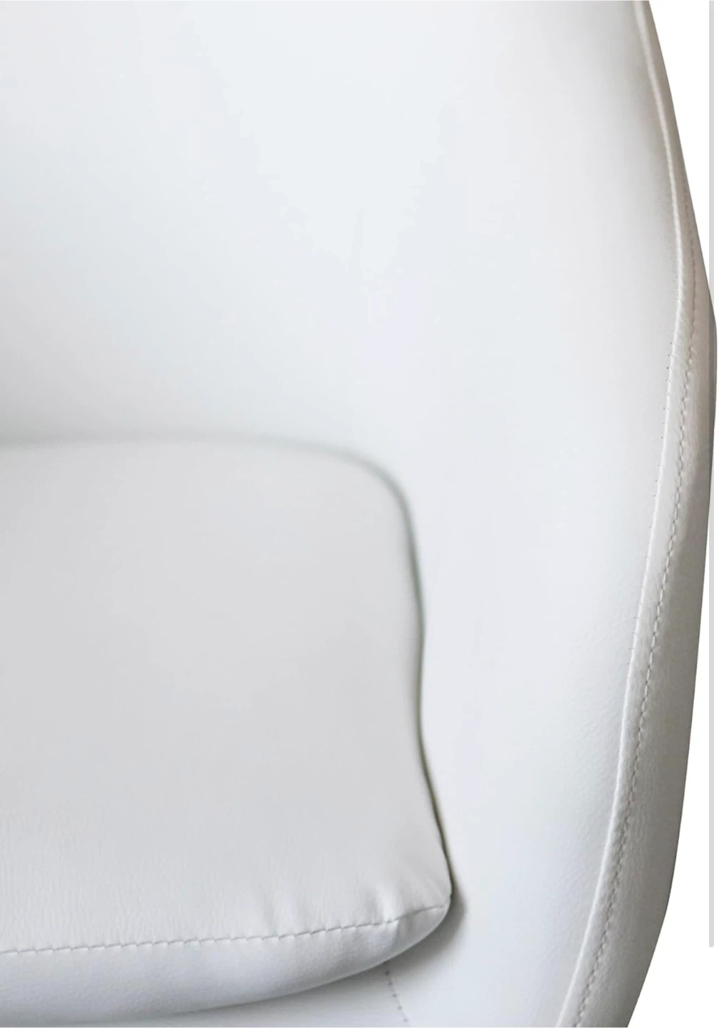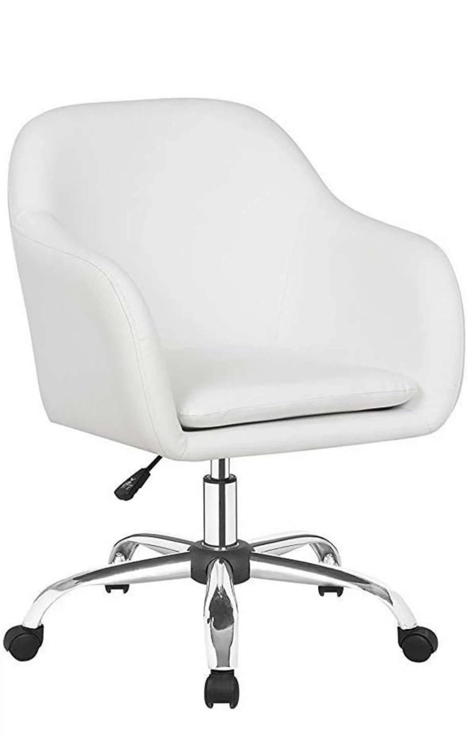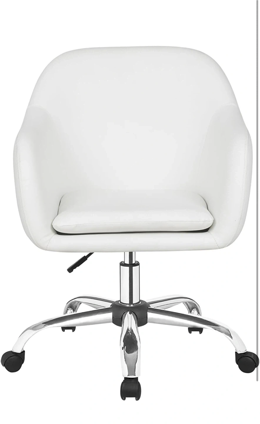 This is a white office chair with a rolling base and adjustable height. It's made of faux leather. The chair measures 83.82cm high, 57.15cm wide, and 52.07cm deep. This chair is handy for home offices or workspaces!