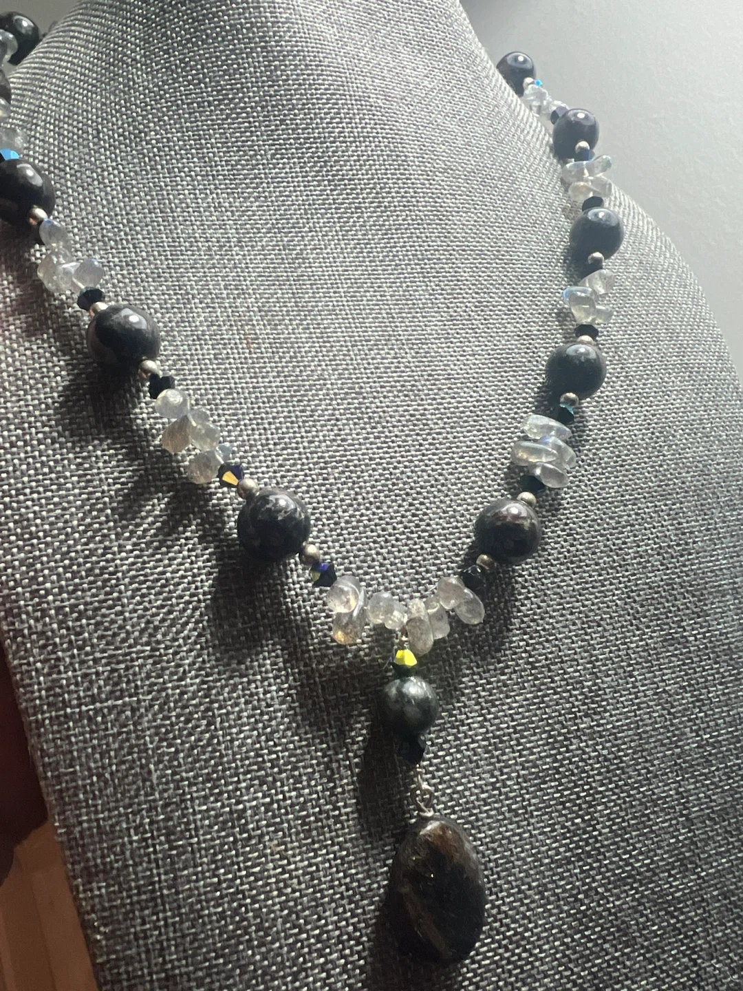 This is a unique 925 silver necklace featuring labradorite and hematite. The clasp. It's a lovely statement piece for any occasion.