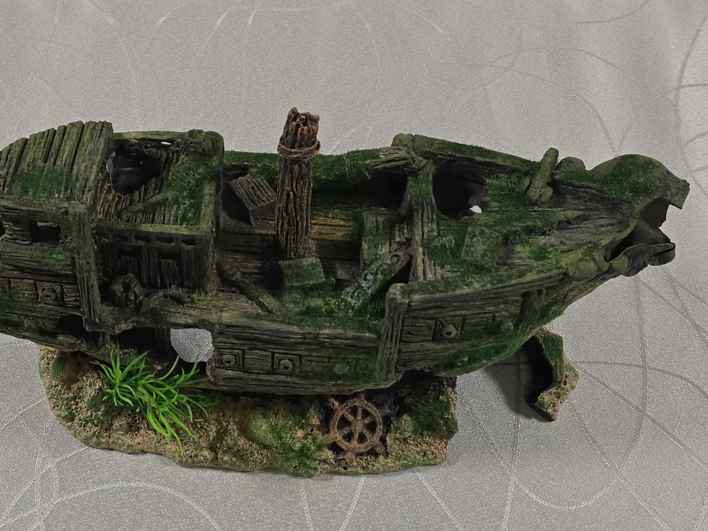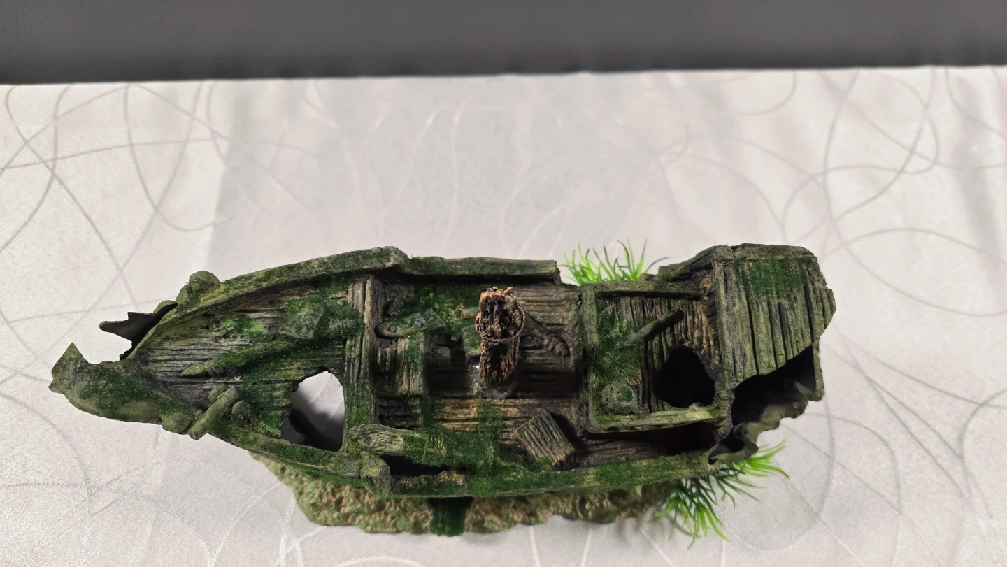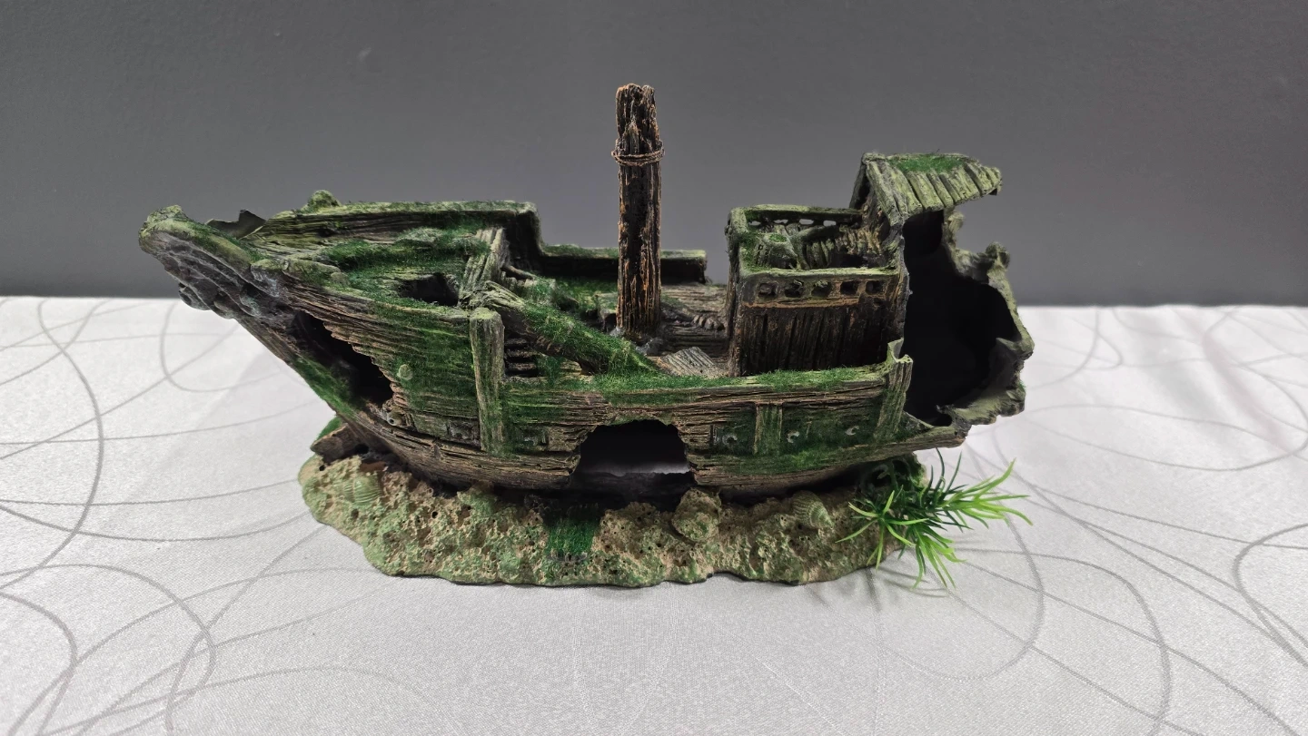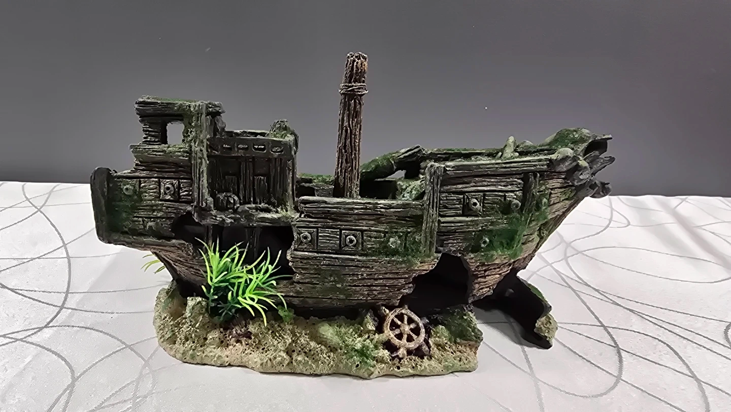 Add some character to your fish tank with this detailed shipwreck ornament. It’s in great condition and features realistic wood textures, moss accents, and a built-in "sandy" base with a tiny ship's wheel.