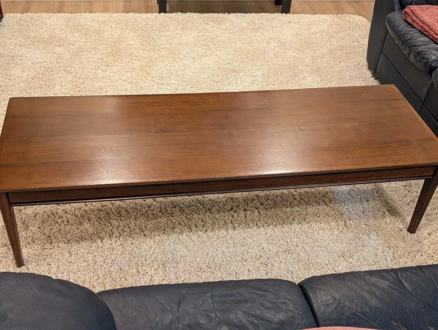 A simple wooden coffee table with a dark wood finish. Its rectangular shape makes it a practical addition to any living room. It's a great size for placing drinks and decor.