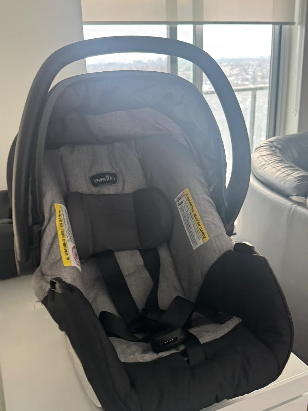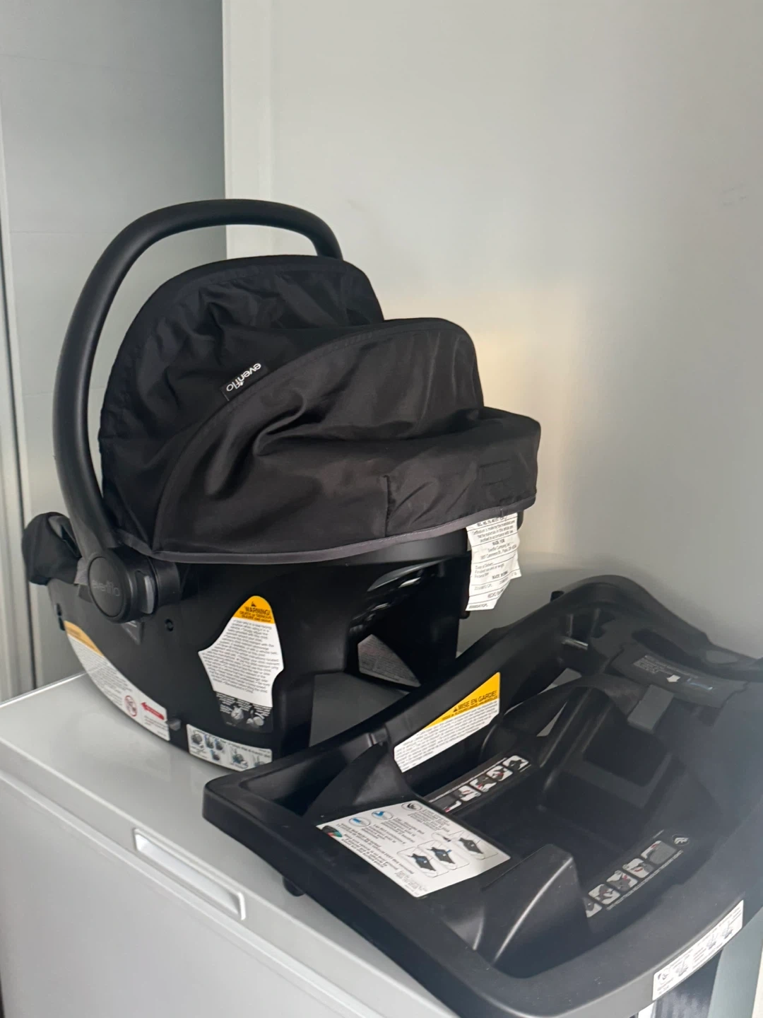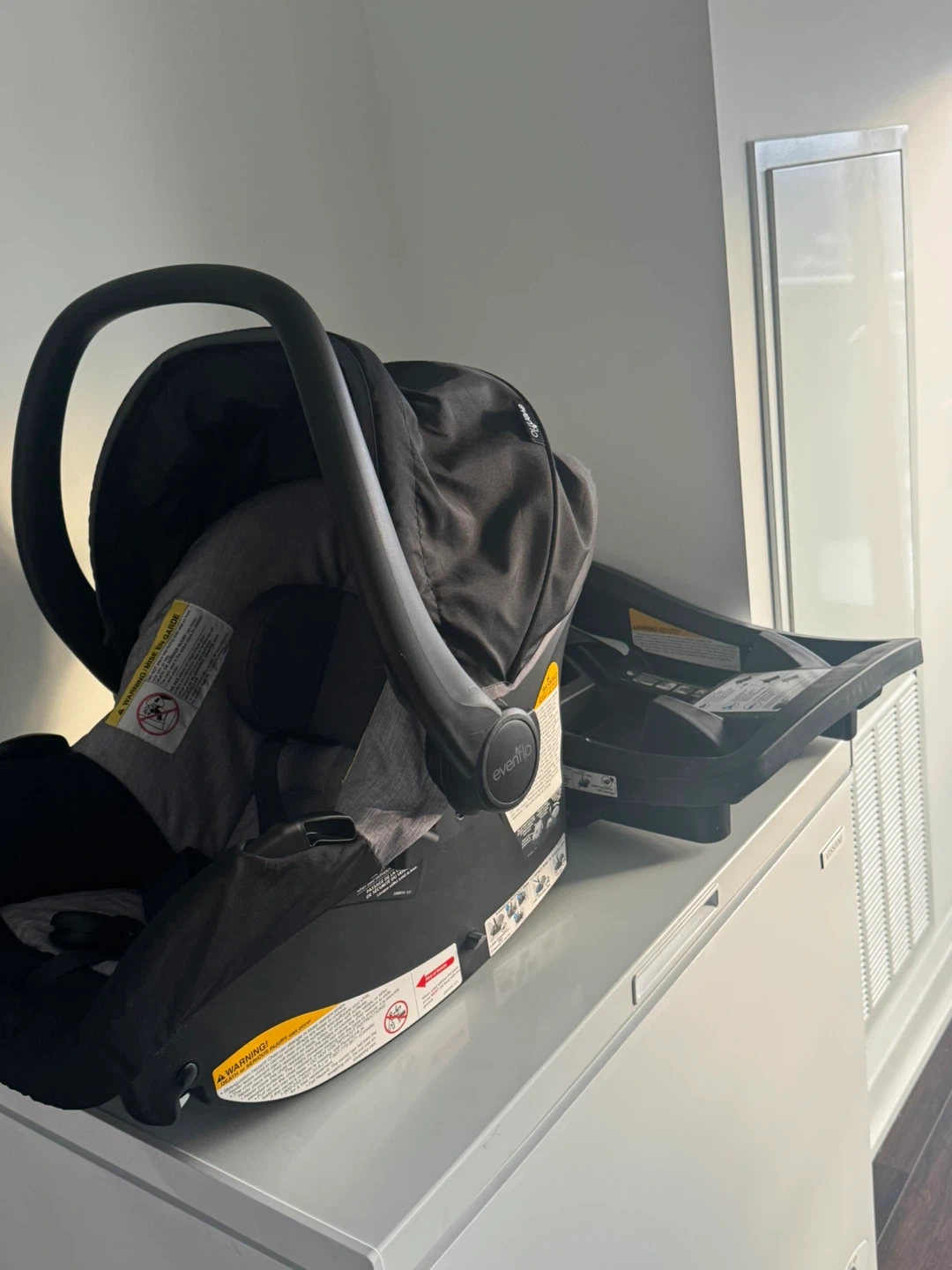 Evenflo infant car seat and base set. It's grey and black with a padded insert. The car seat has a canopy and adjustable harness. Includes the car seat base for easy installation.
