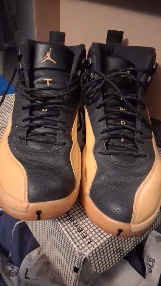 Selling a pair of Jordan 12 Retro 'Royalty Taxi' sneakers in size 13 They are in good condition with some signs of wear, as shown in the pictures. These classic Jordans feature a black and gold colorway and are perfect for basketball or casual wear