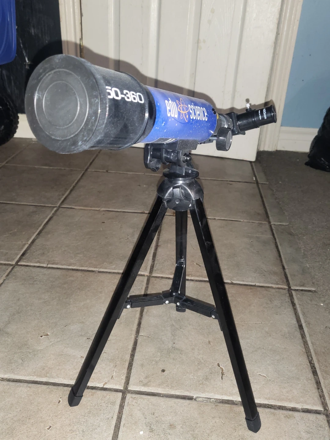 This Edu-Science telescope comes with a tripod for stable viewing. It's designed for educational use and includes a 50mm aperture and 360mm focal length. Great for budding astronomers eager to explore the night sky!