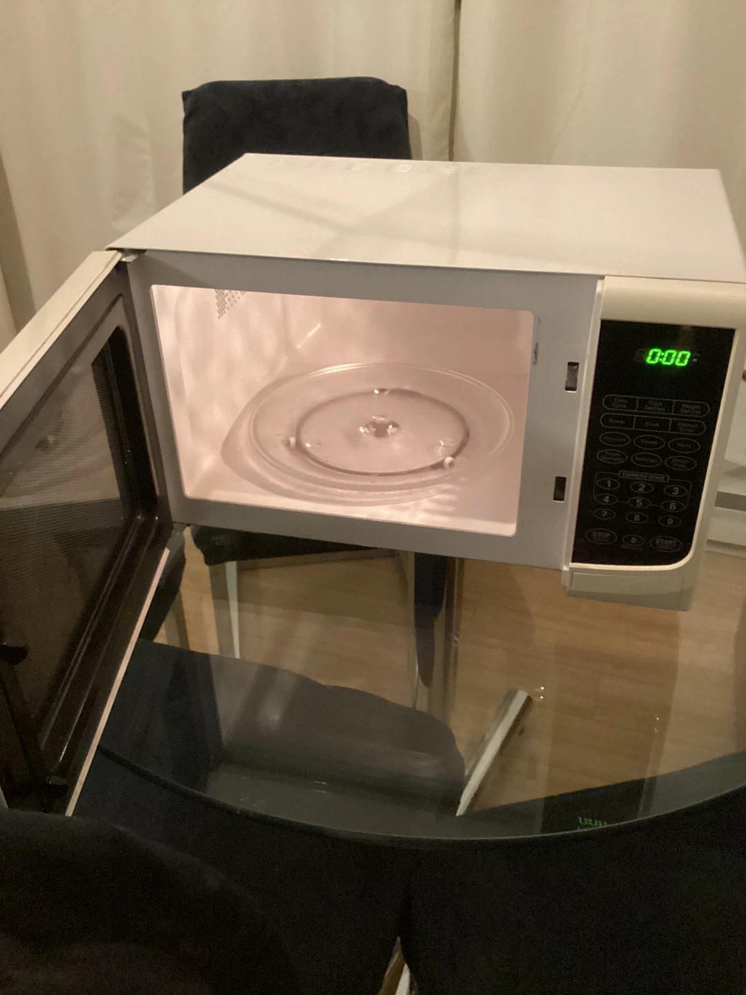White Danby microwave oven. It includes a rotating glass turntable inside. The digital display shows the time or cooking settings. Great for quick meals and reheating. Clean and ready to go! In good used condition. Just changed colour of appliances.