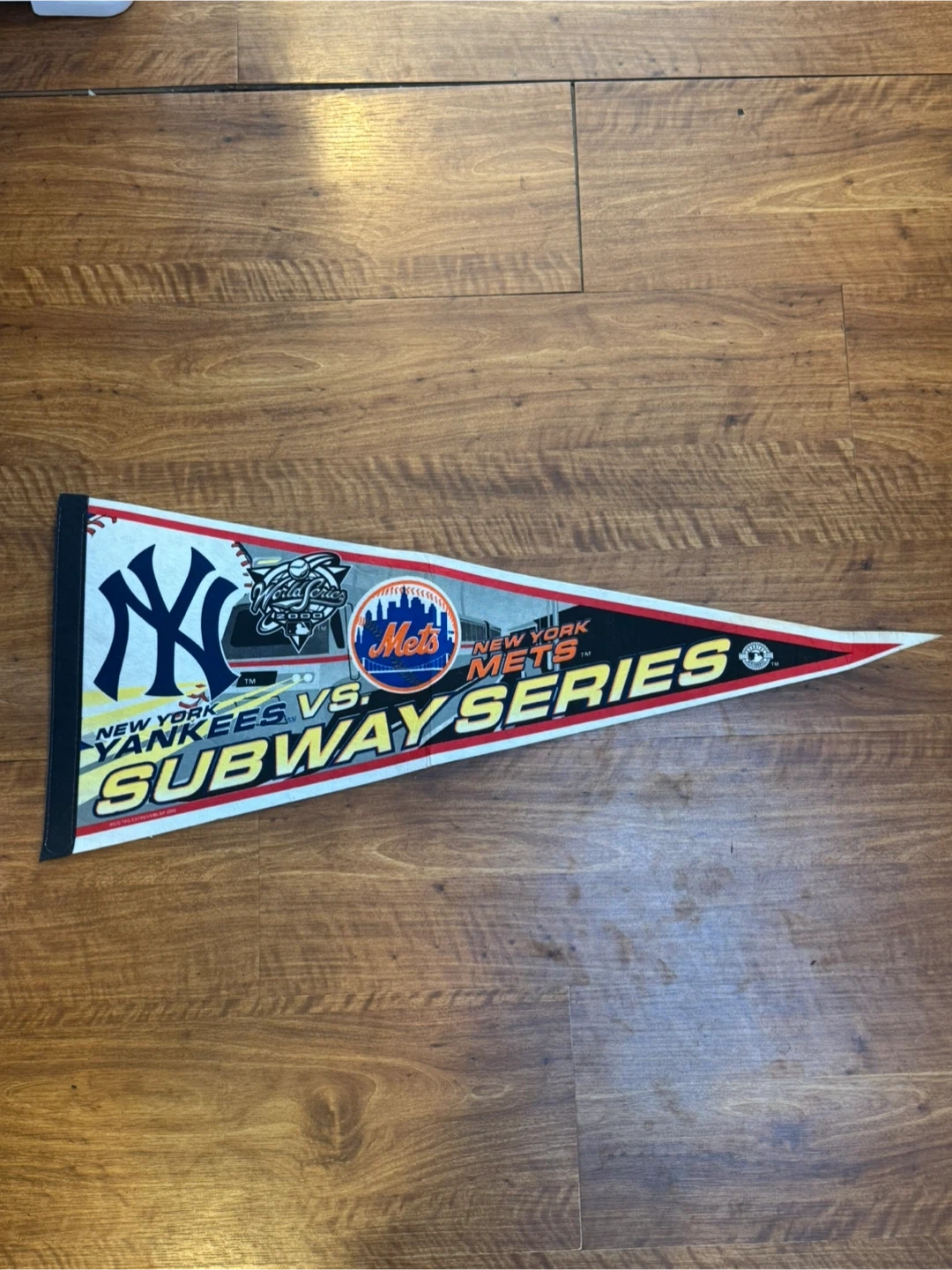 This pennant commemorates the 2000 World Series Subway Series between the New York Yankees and the New York Mets. It features logos for both teams and the official World Series 2000 mark. Felt material with printed graphics.