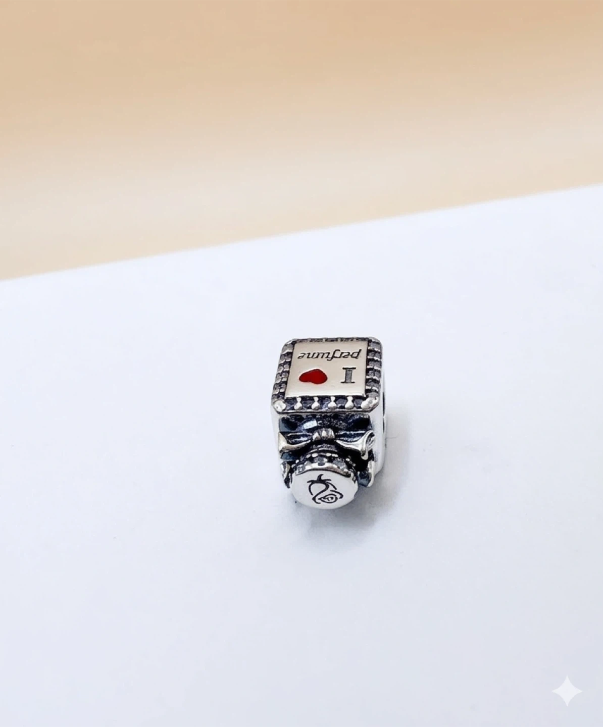 😍Sterling silver charm shaped like a perfume bottle. It features "I love perfume" text with pink accents and a red heart detail. S925 hallmark visible.