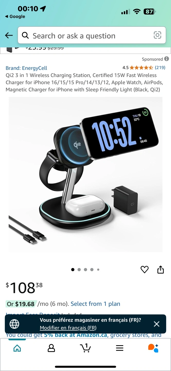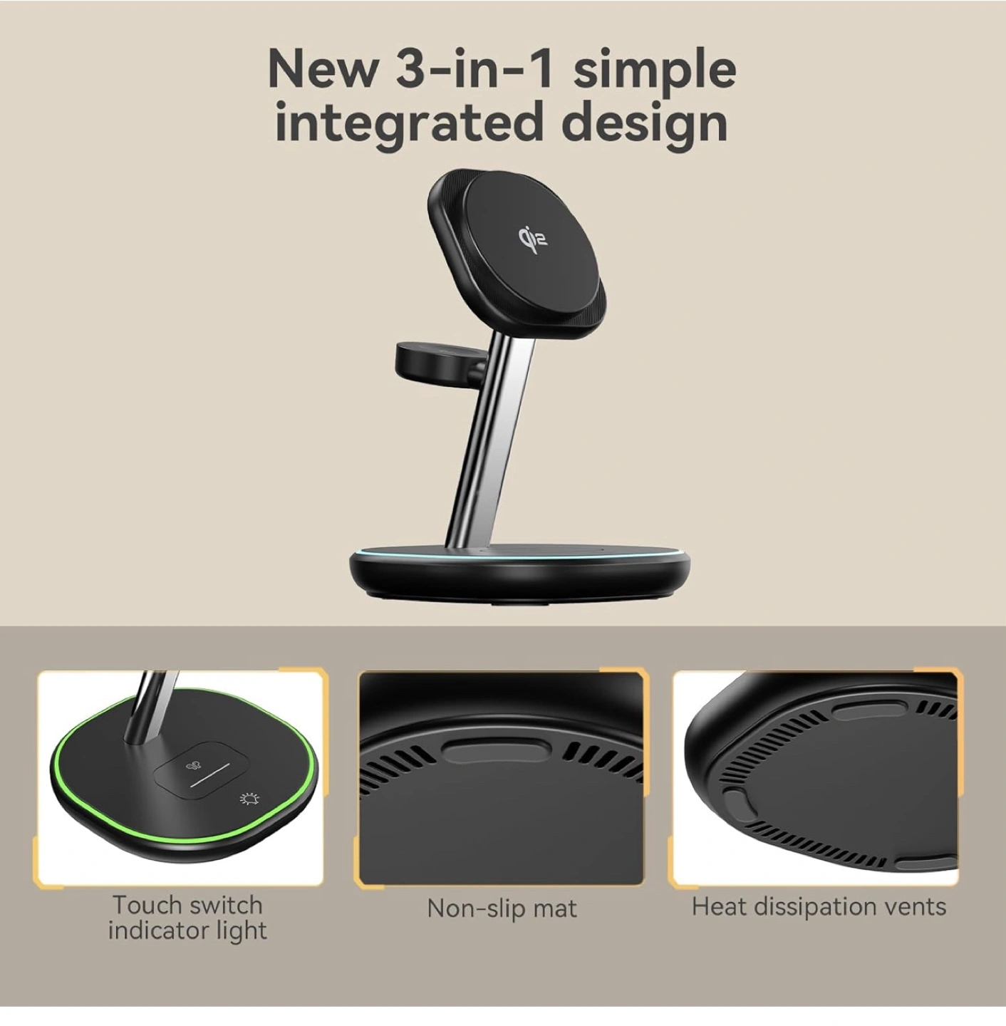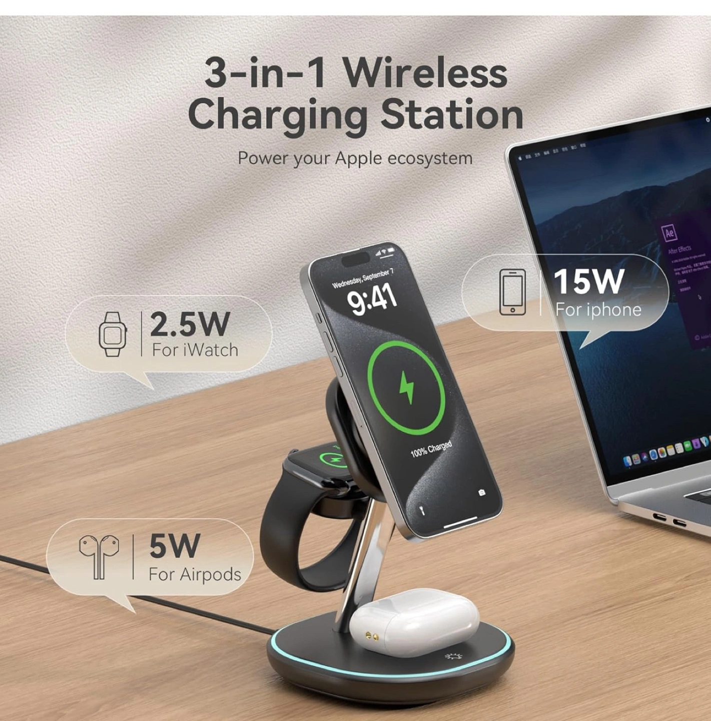 3-in-1 wireless charging station. Charges iPhone, Apple Watch, and AirPods simultaneously. Features 15W MagSafe fast charging for iPhone, 5W for AirPods, and 2.5W for Apple Watch. Sleek design, Qi2 certified, compatible with all iOS and watchOS updates. Includes non-slip mat and heat dissipation vents.