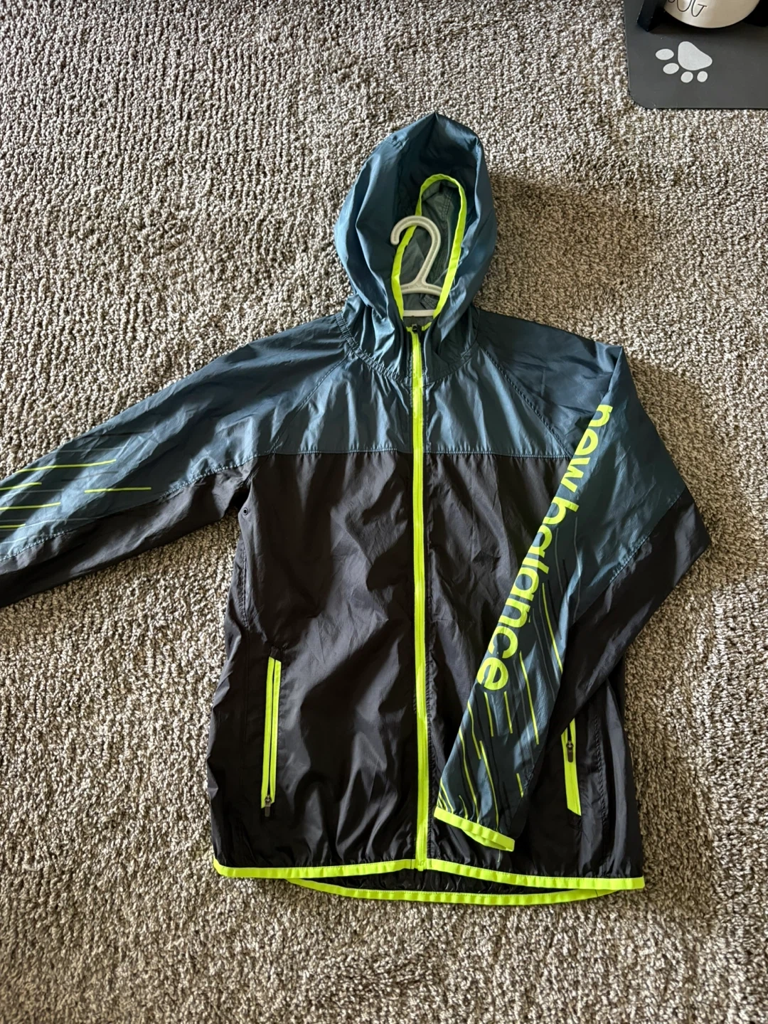 This is a New Balance hooded windbreaker jacket. It's a lightweight, packable jacket with a full zip closure and zippered pockets. The jacket features a two-tone colour design with neon green accents and branding on the sleeve. Perfect for windy days or light rain!