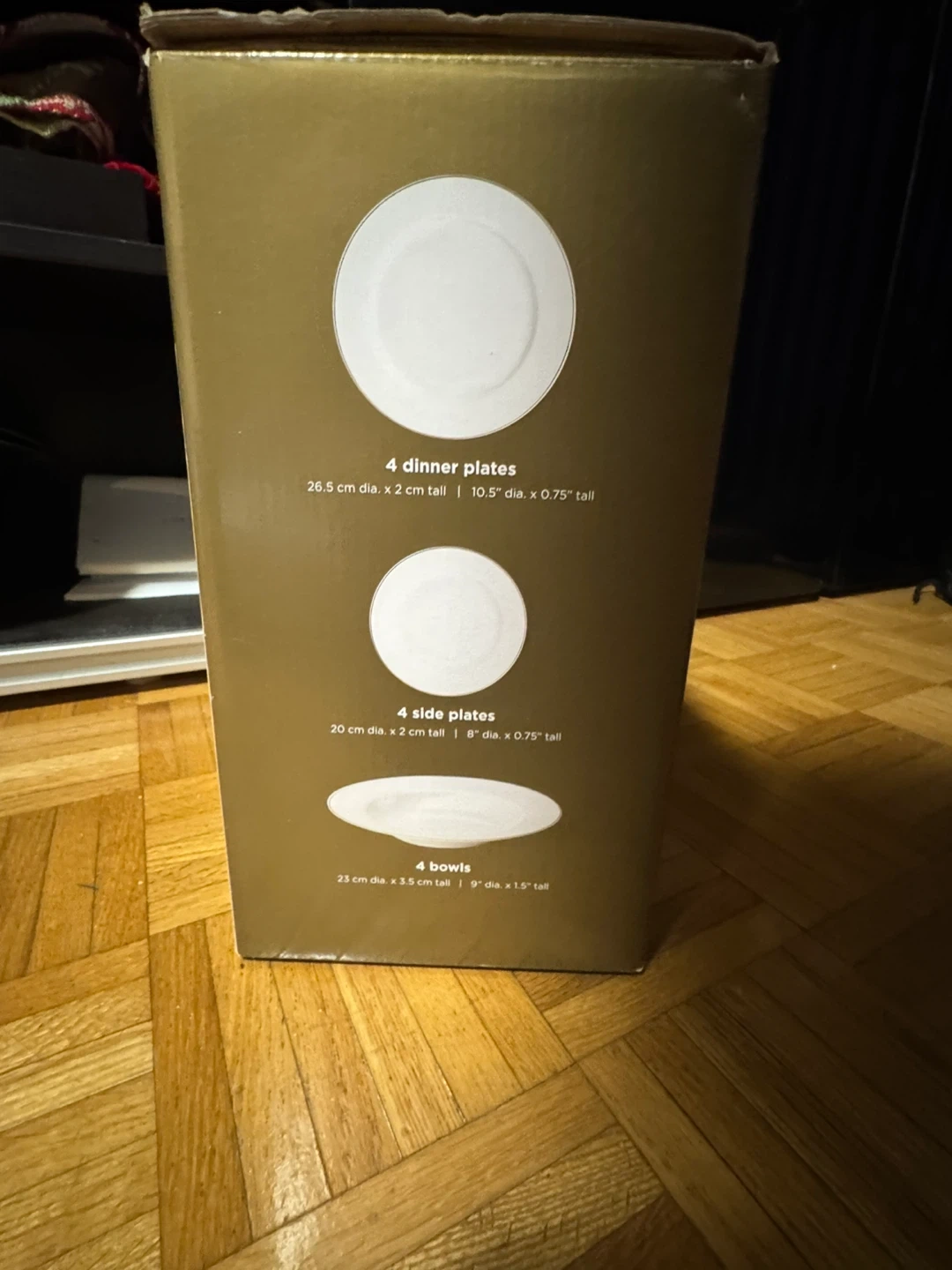 This set includes 4 dinner plates, 4 side plates, and 4 bowls made of new bone china. White with gold trim. The dinner plates are 26.5 cm in diameter, the side plates are 20 cm, and the bowls are 23 cm. It's a lovely set for everyday use or special occasions!