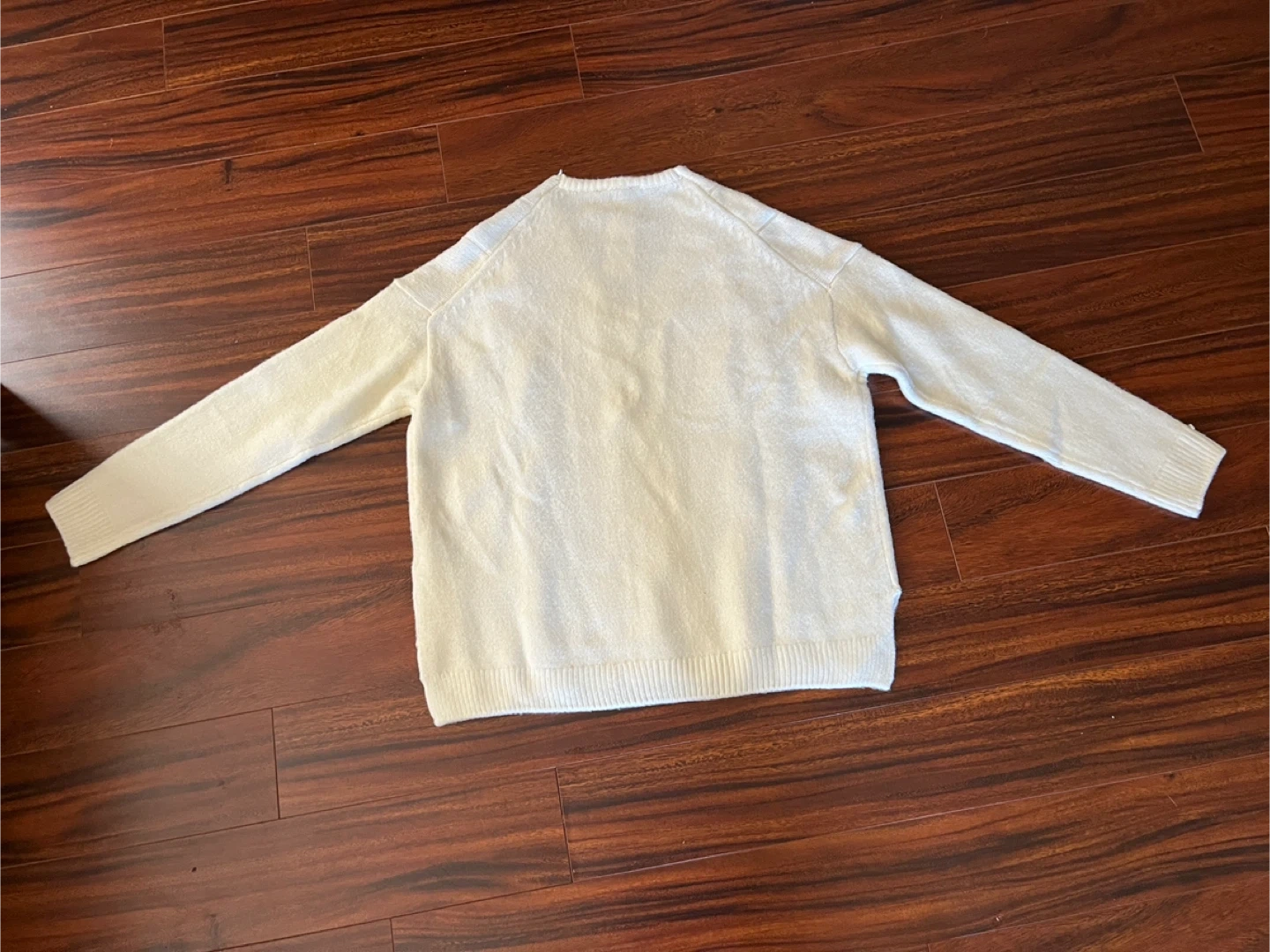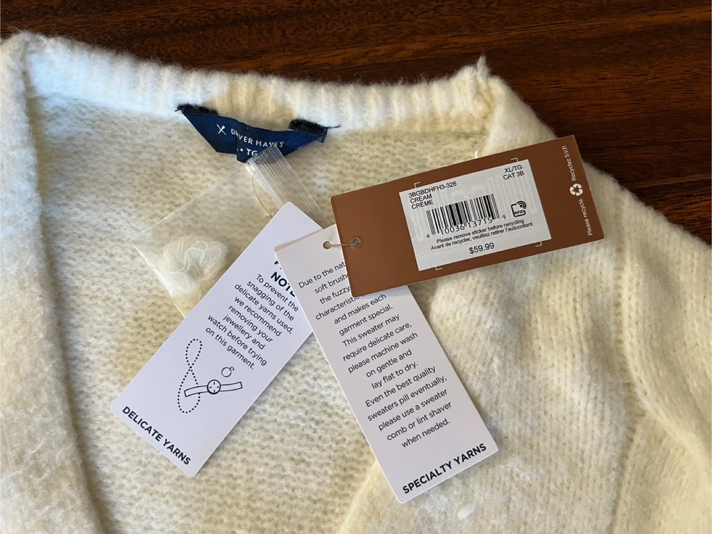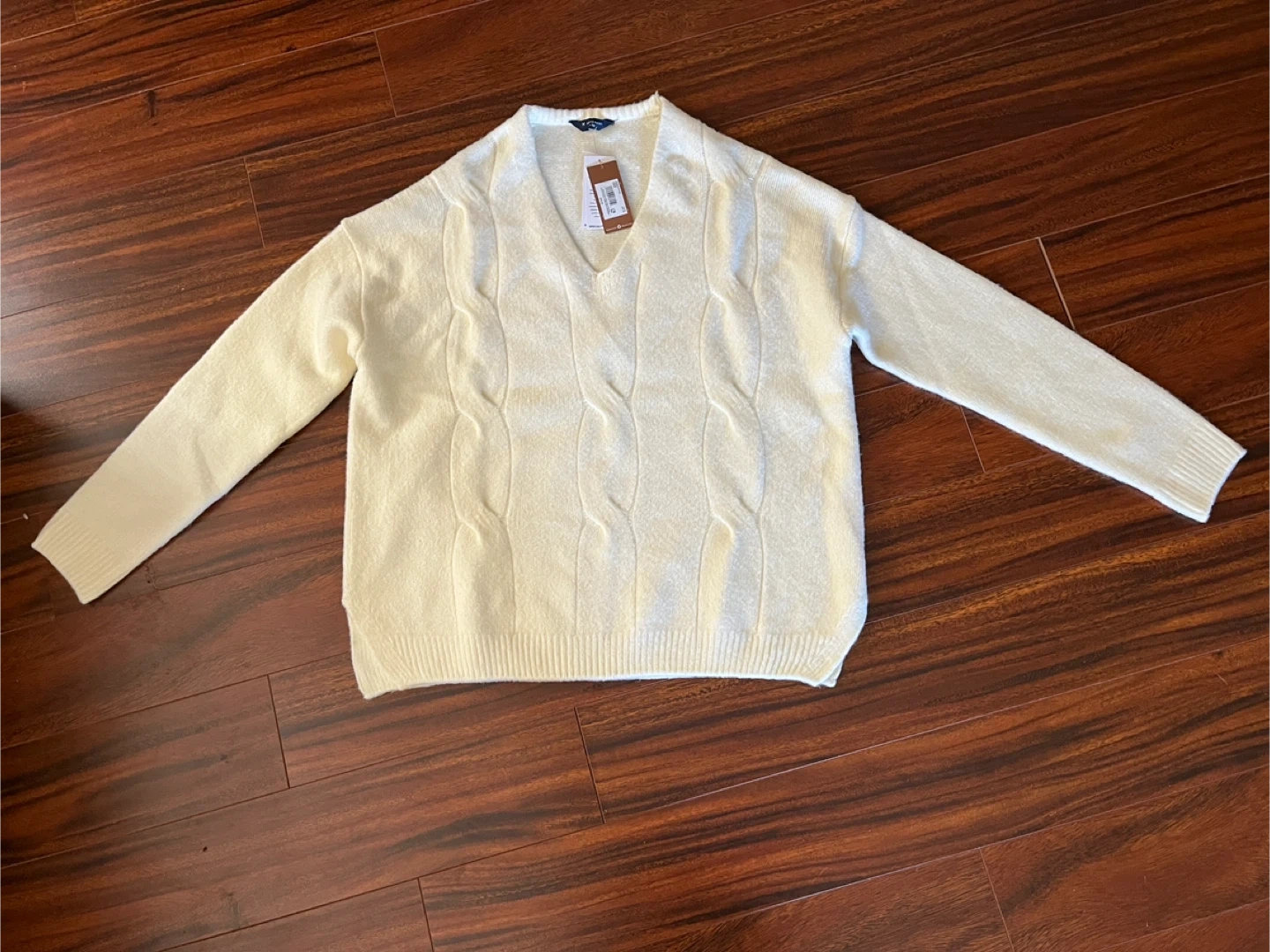 New with tags Denver Hayes women’s extra large sweater in a soft cream colour. Brushed textured knit with cable-style pattern, v-neckline and relaxed drop-shoulder fit. Ribbed cuffs and hem with side slits. Never worn. Smoke-free home.