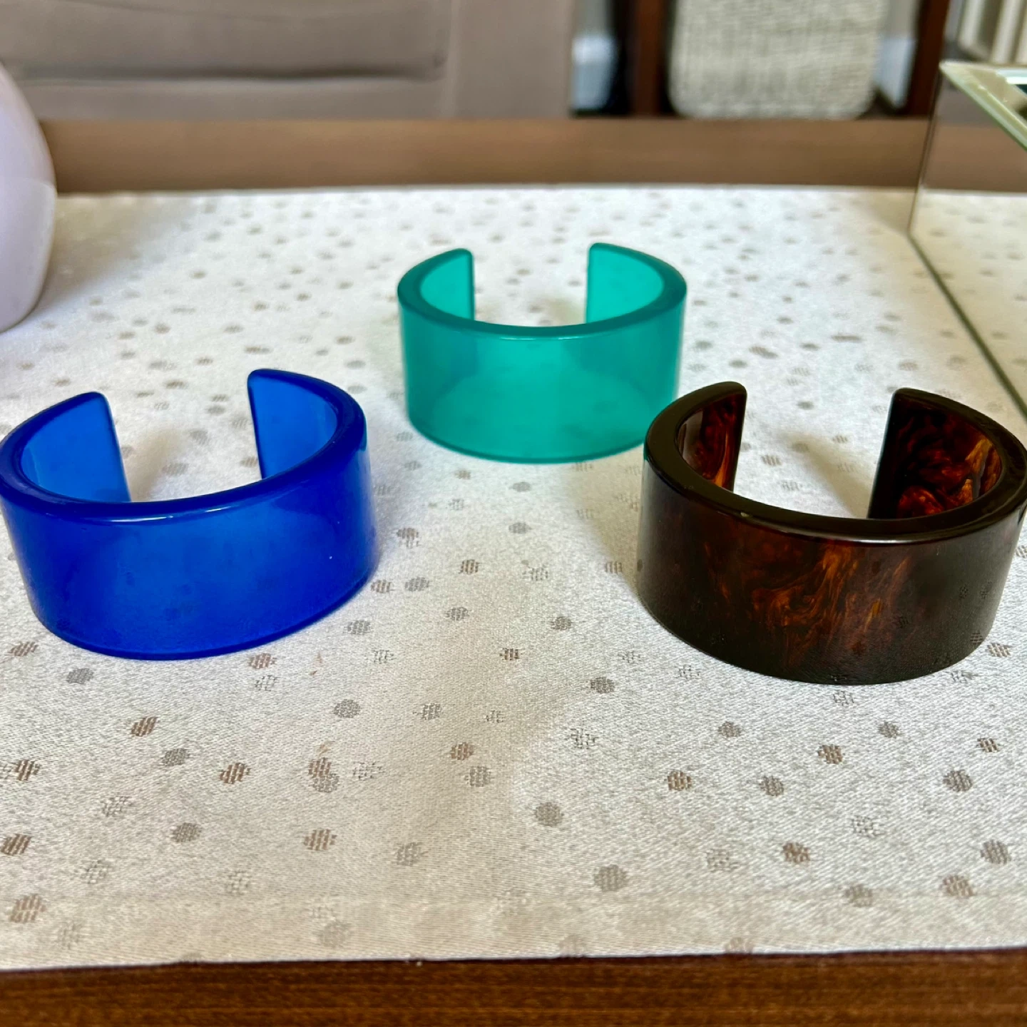 This set includes three resin cuff bracelets in blue, teal, and tortoiseshell. They're stylish and versatile, perfect for adding a pop of colour to any outfit. The smooth finish and open cuff design make them comfortable to wear. Choose one, two or all three!