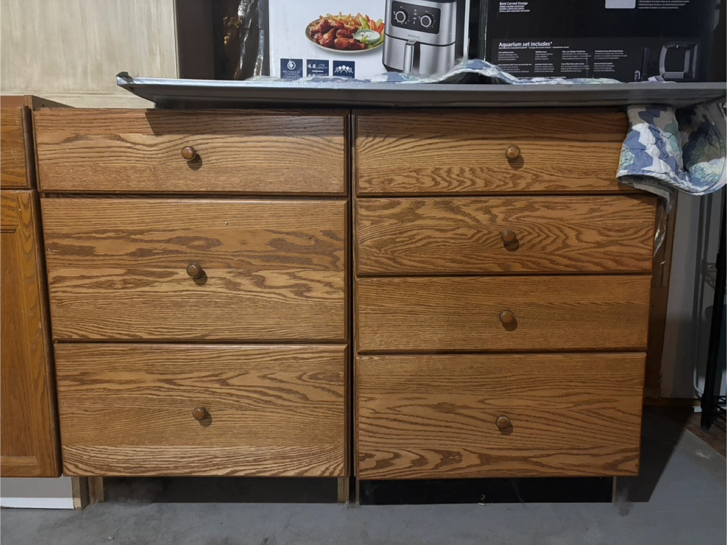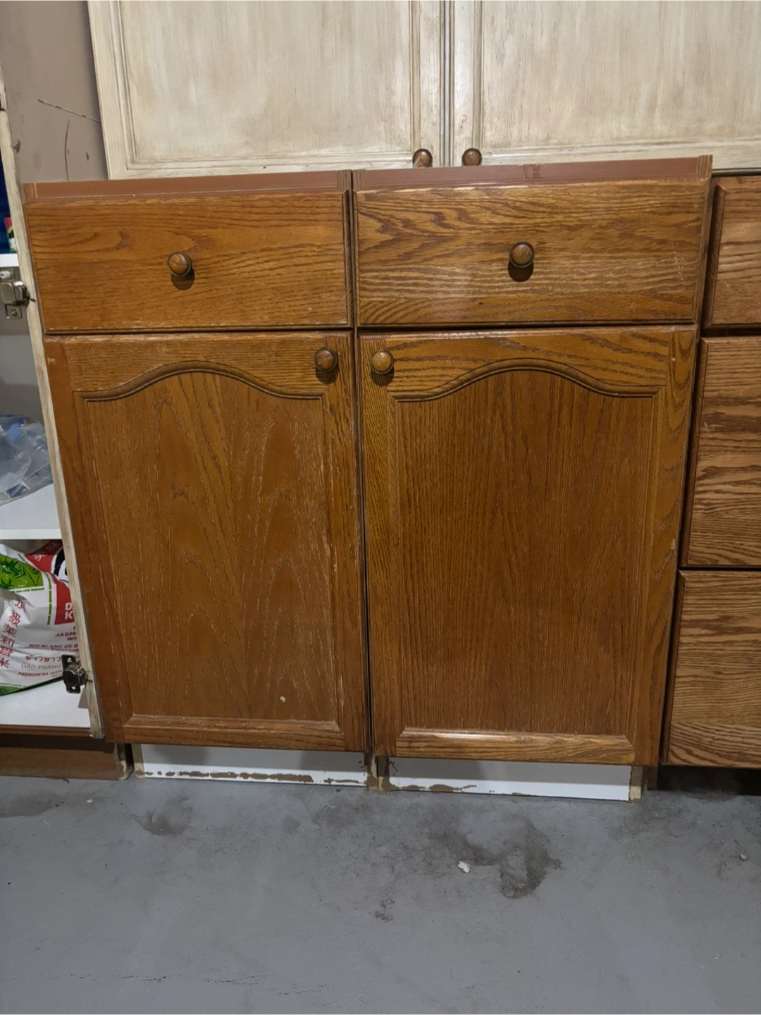 Selling a set of oak kitchen cabinets. 4 pieces. Two all drawers, two cabinets and drawers. Perfect for a garage. Could use some TLC for indoors. 30$ each or all for 100$ open to offer