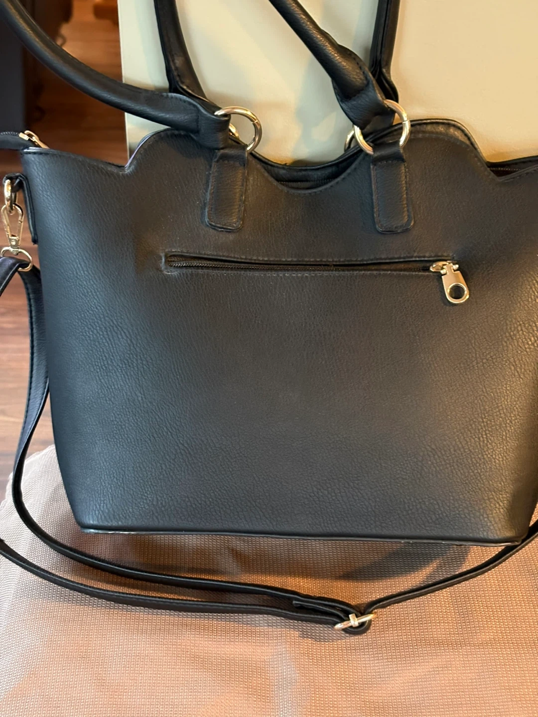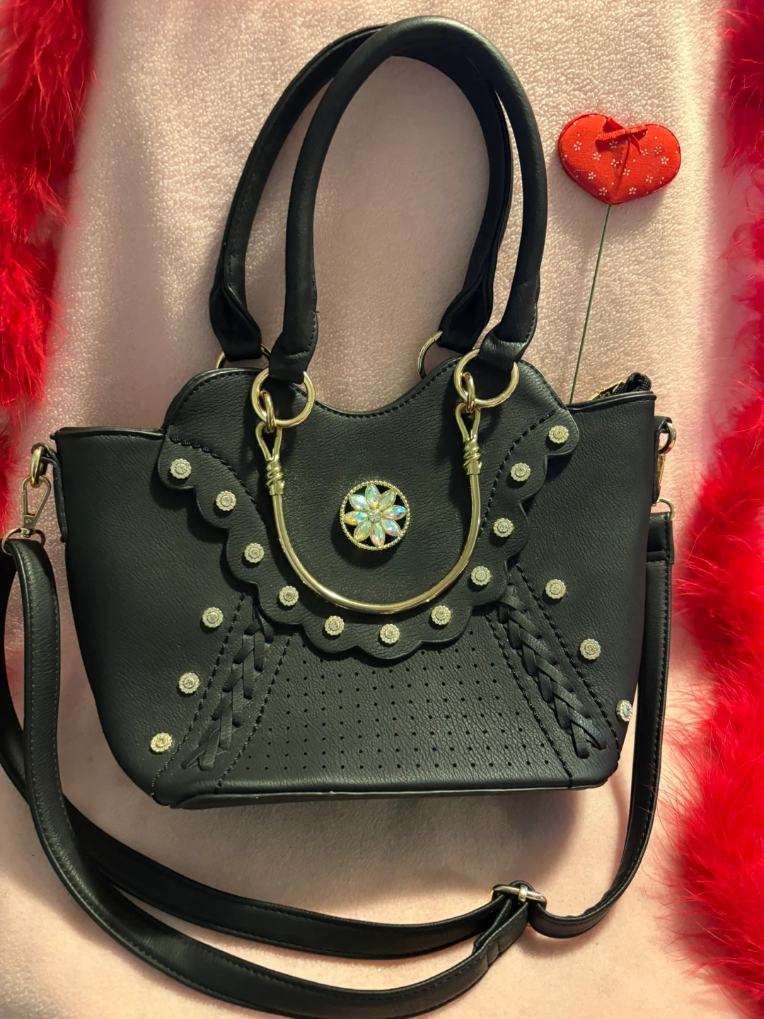 Black Handbag with Rhinestone Flower