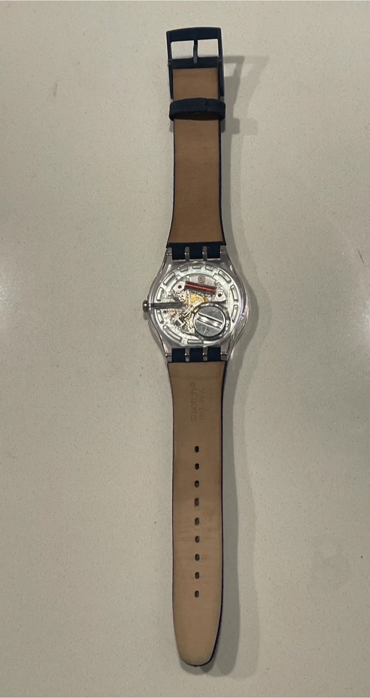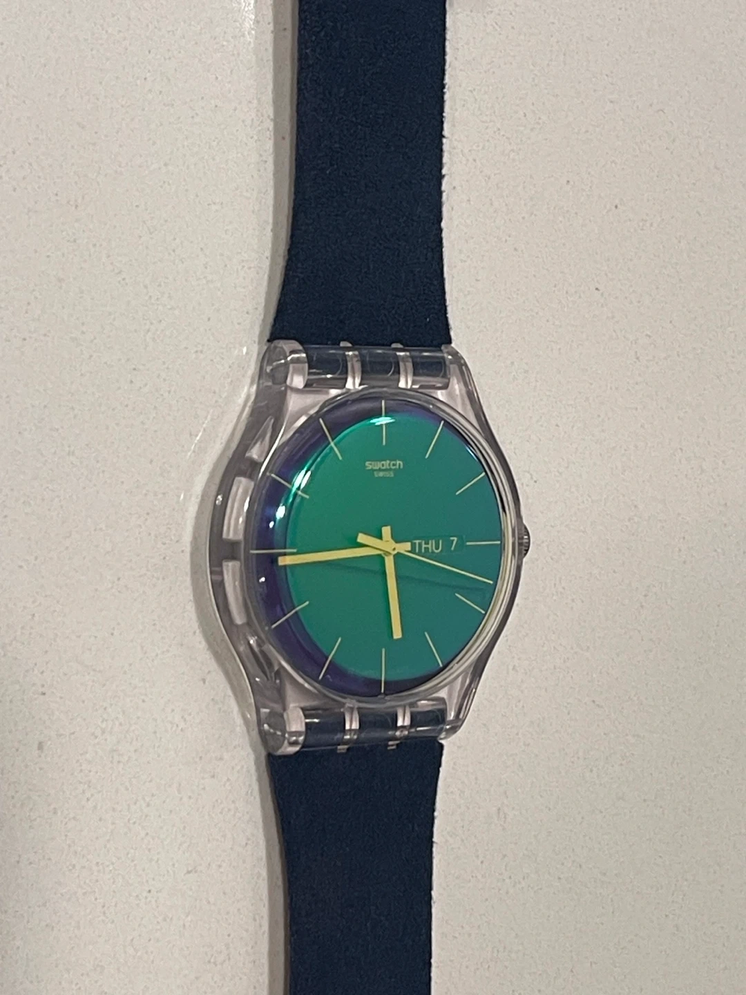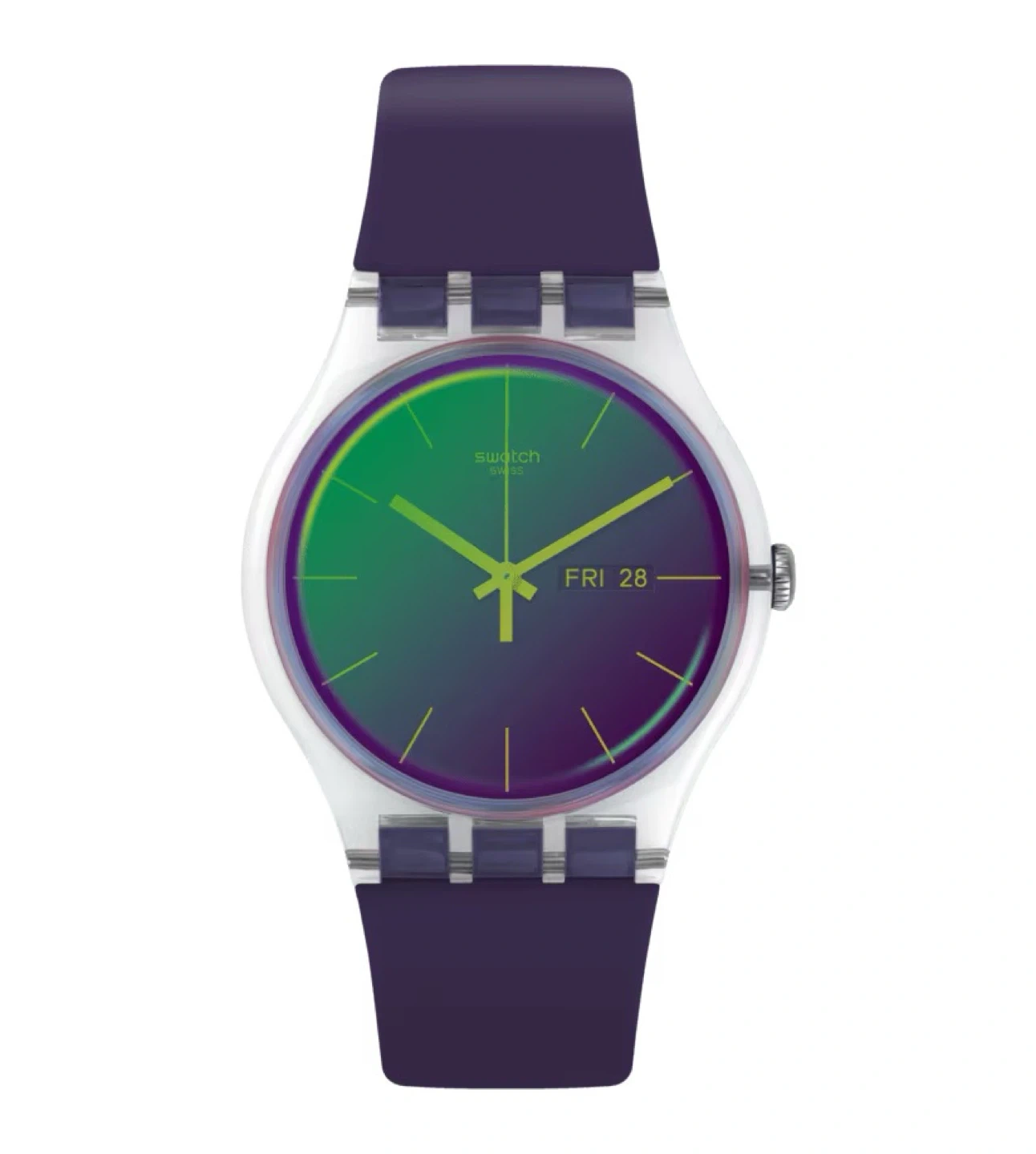 Comes with leather and poly straps. A Swatch watch with a clear case and a gradient green and purple dial. It features a day and date display. The strap is dark blue.