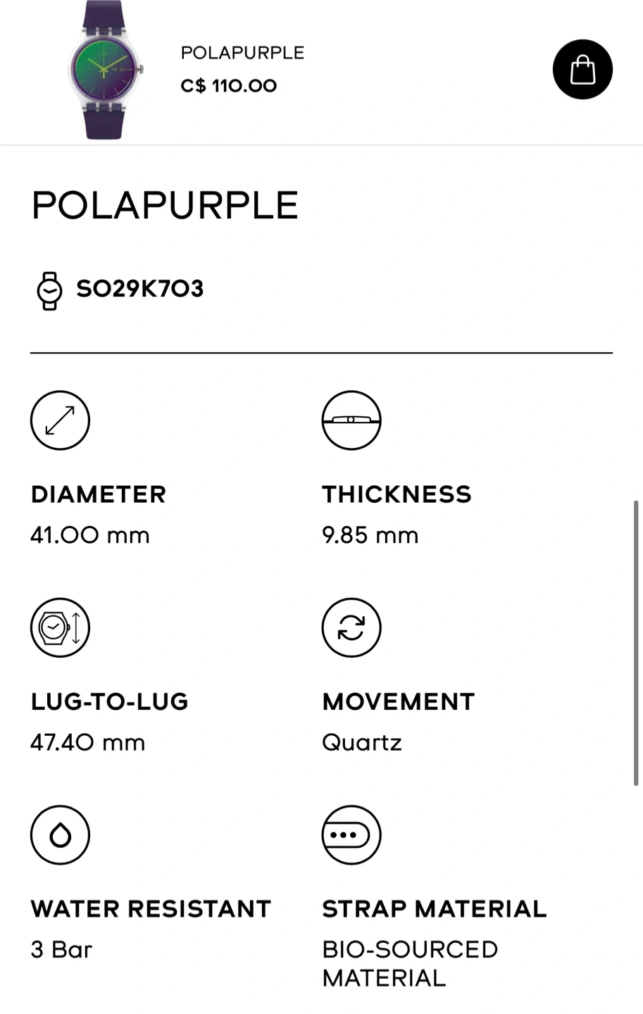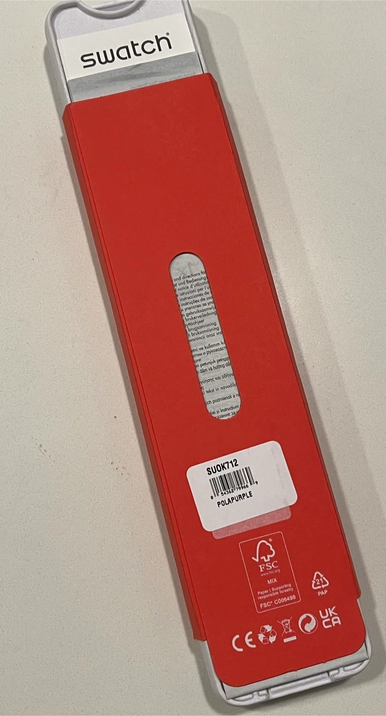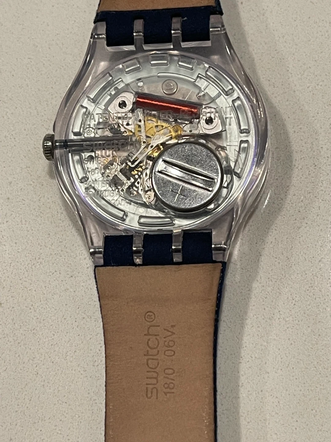 Comes with leather and poly straps. A Swatch watch with a clear case and a gradient green and purple dial. It features a day and date display. The strap is dark blue.