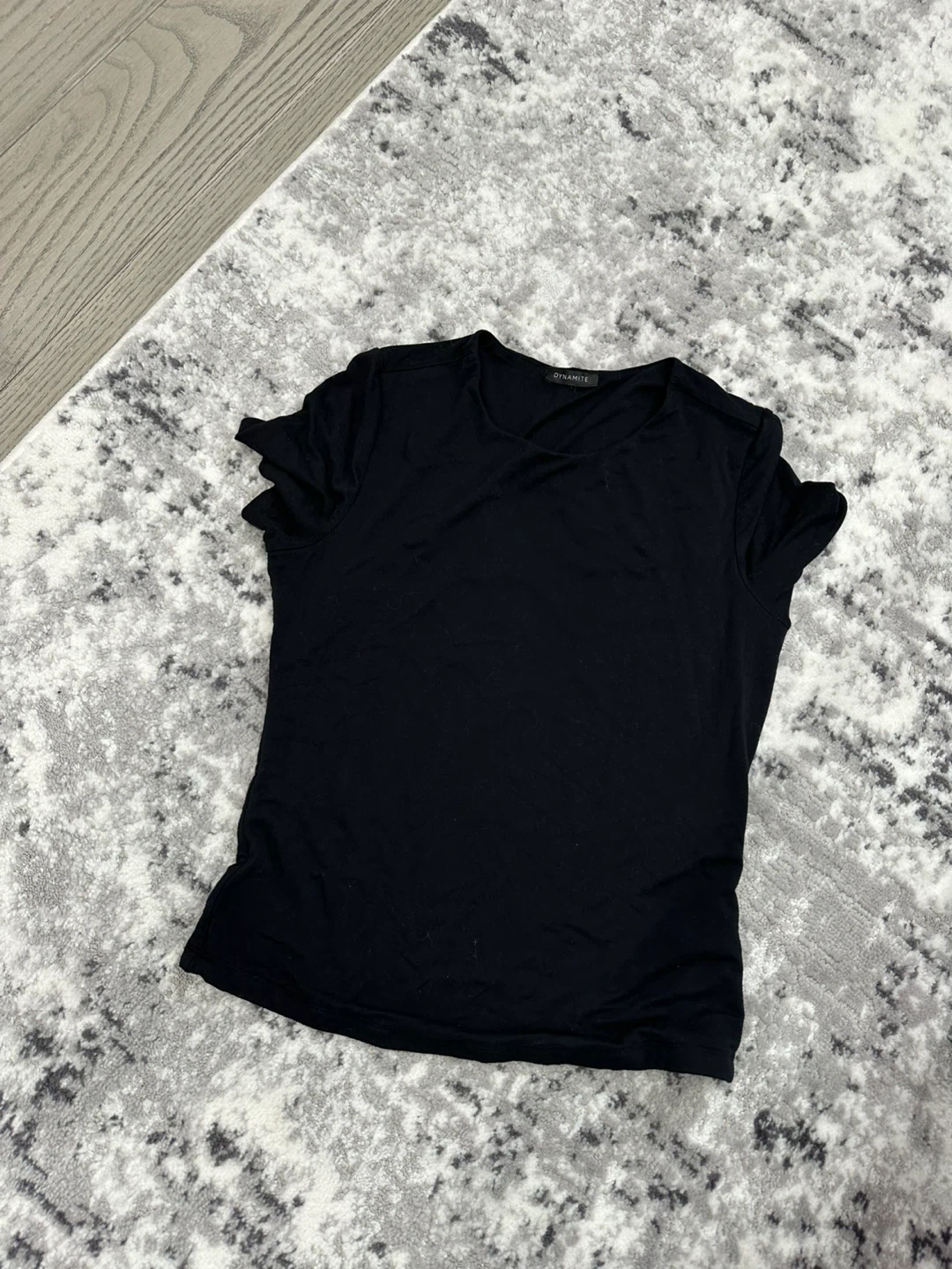 A simple black t-shirt from DYNAMITE. It's a size small. This top is made of a soft, breathable fabric.