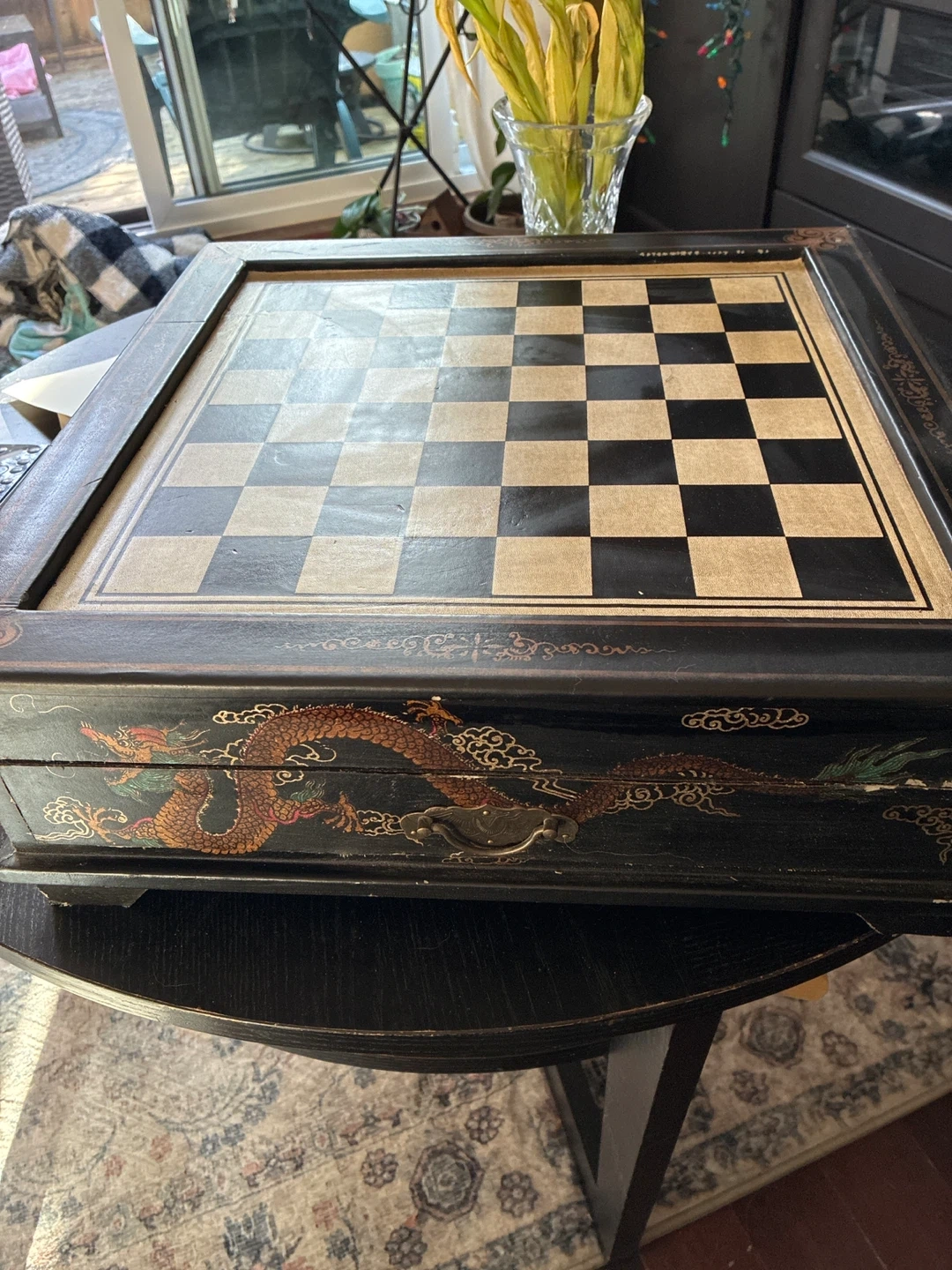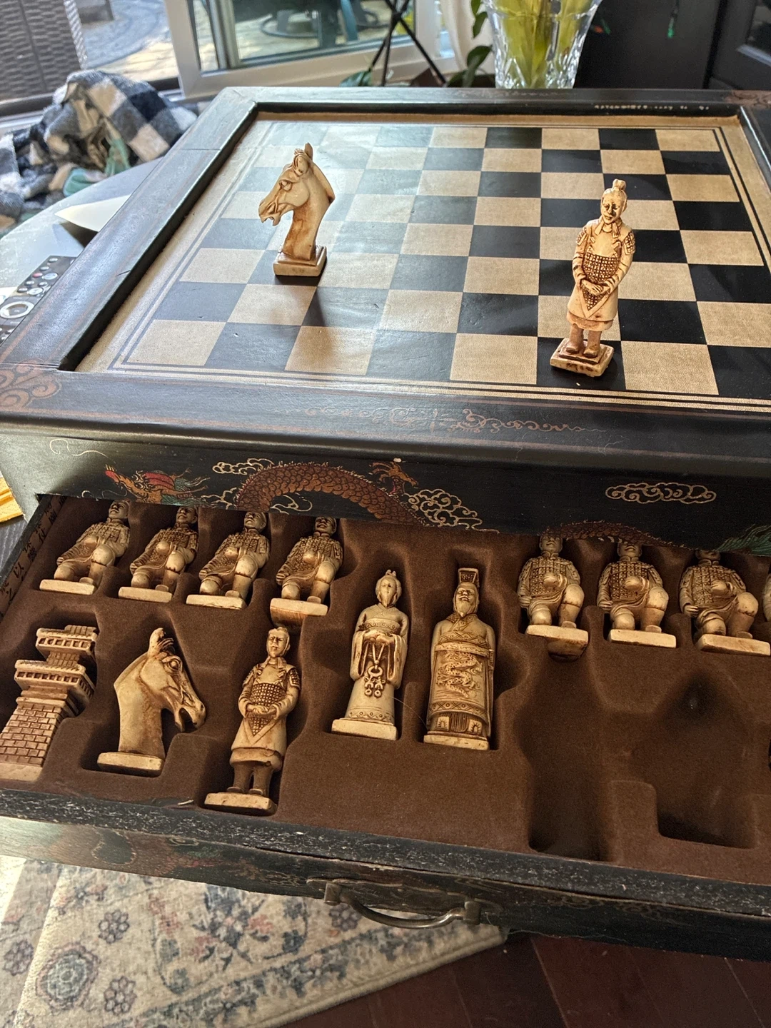 This unique chess set features a decorative black case adorned with a dragon motif and intricate designs. It includes a full set of chess pieces, designed to resemble ancient warriors. Perfect for display or gameplay!