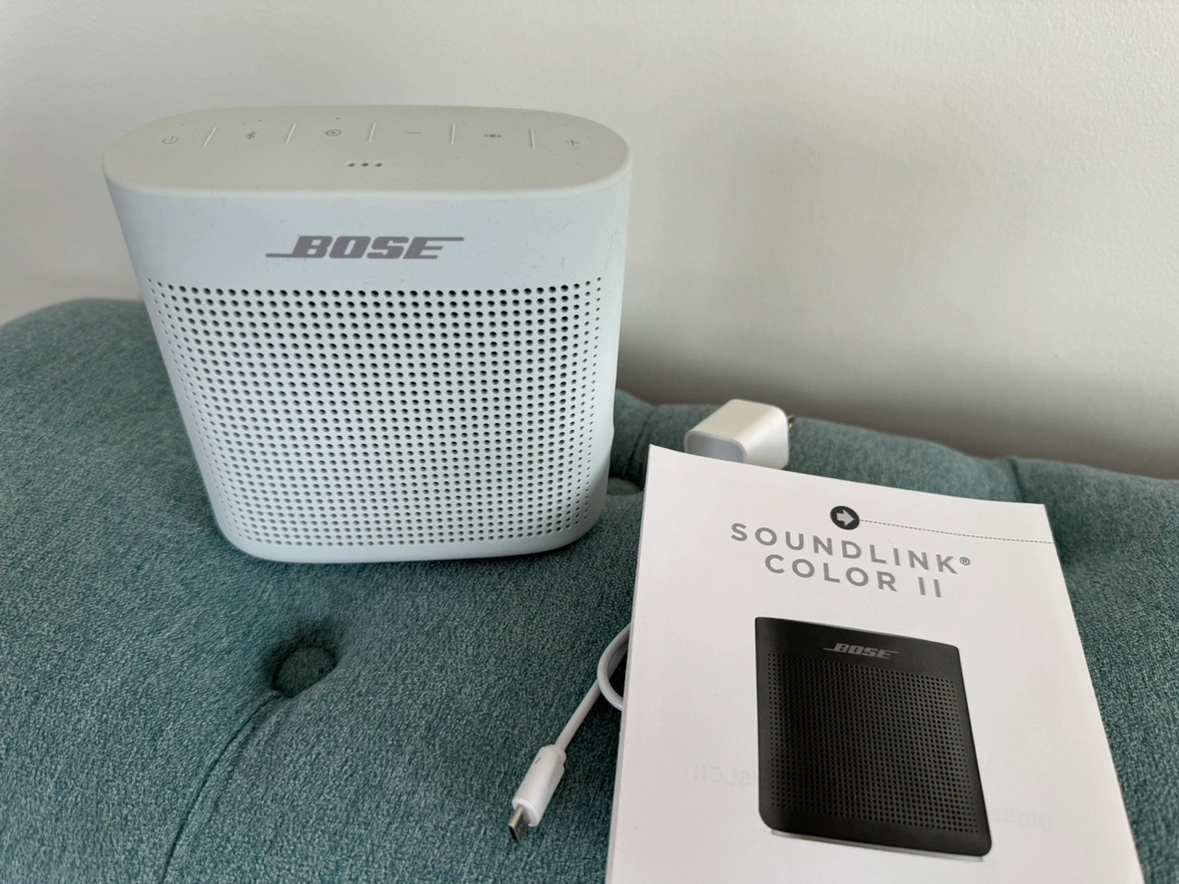 White Bluetooth Speaker. Includes power cord, manual, and power adapter.